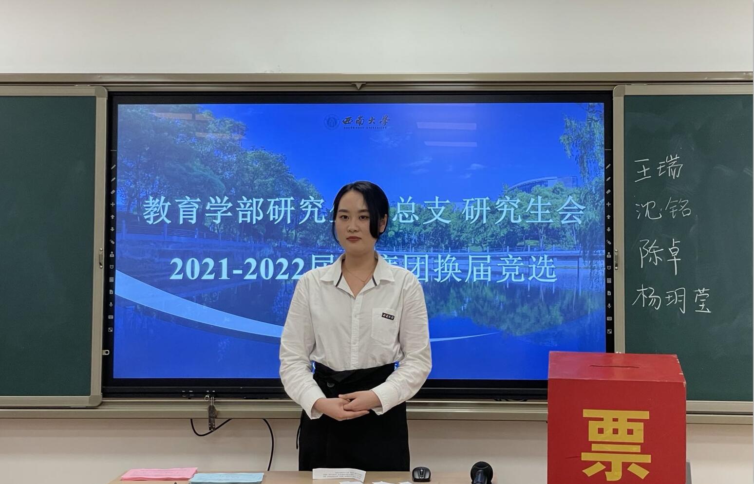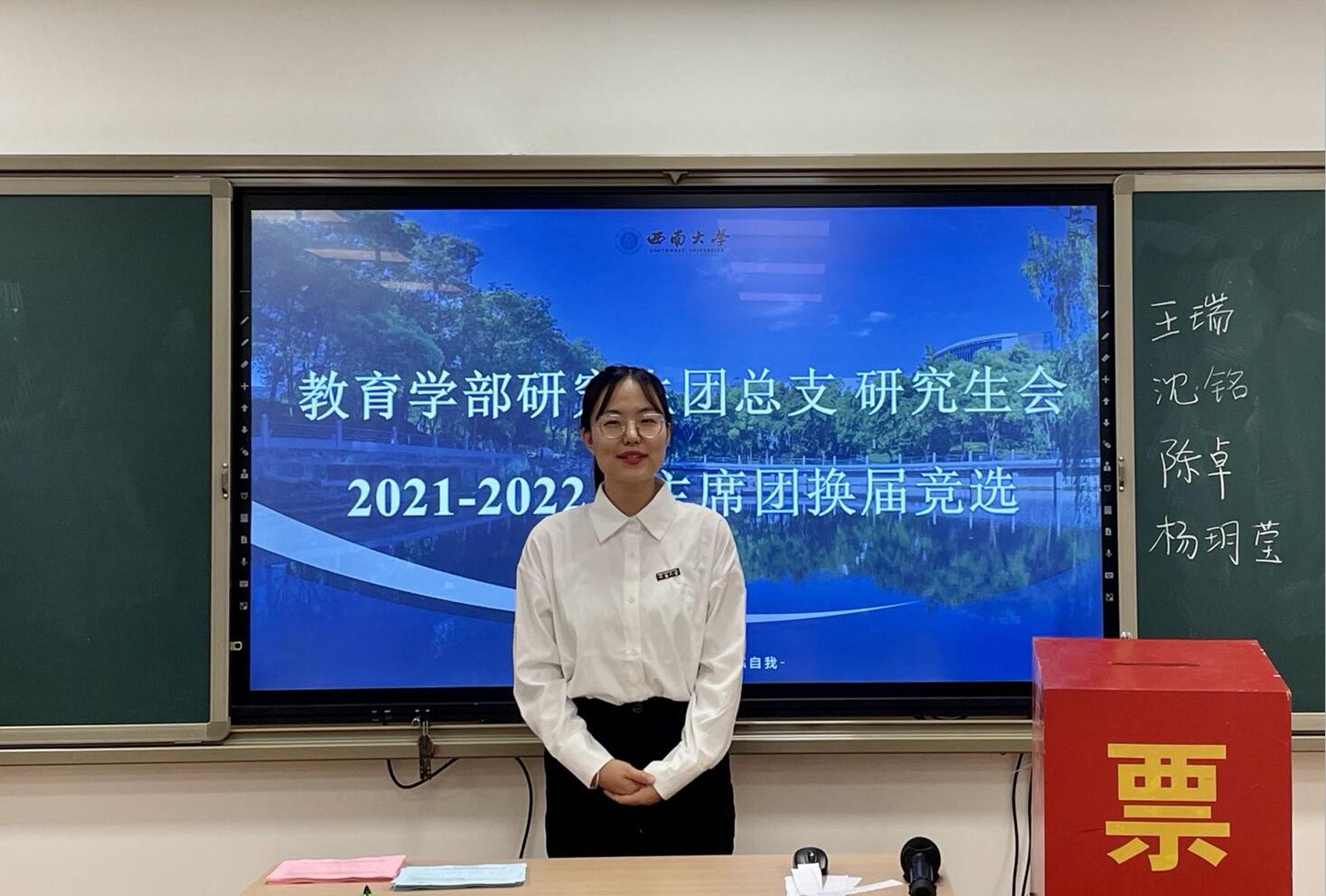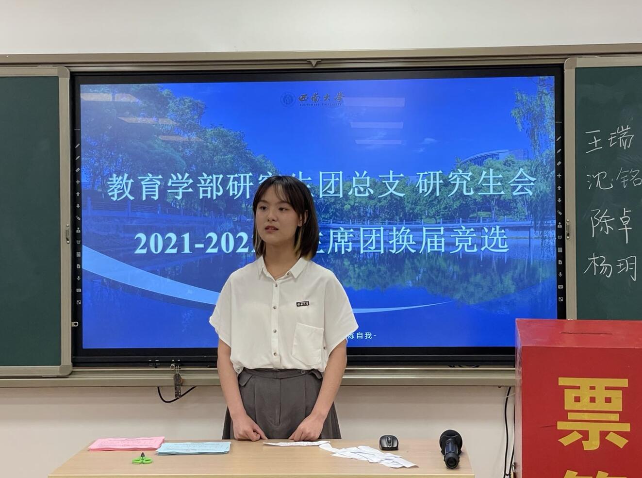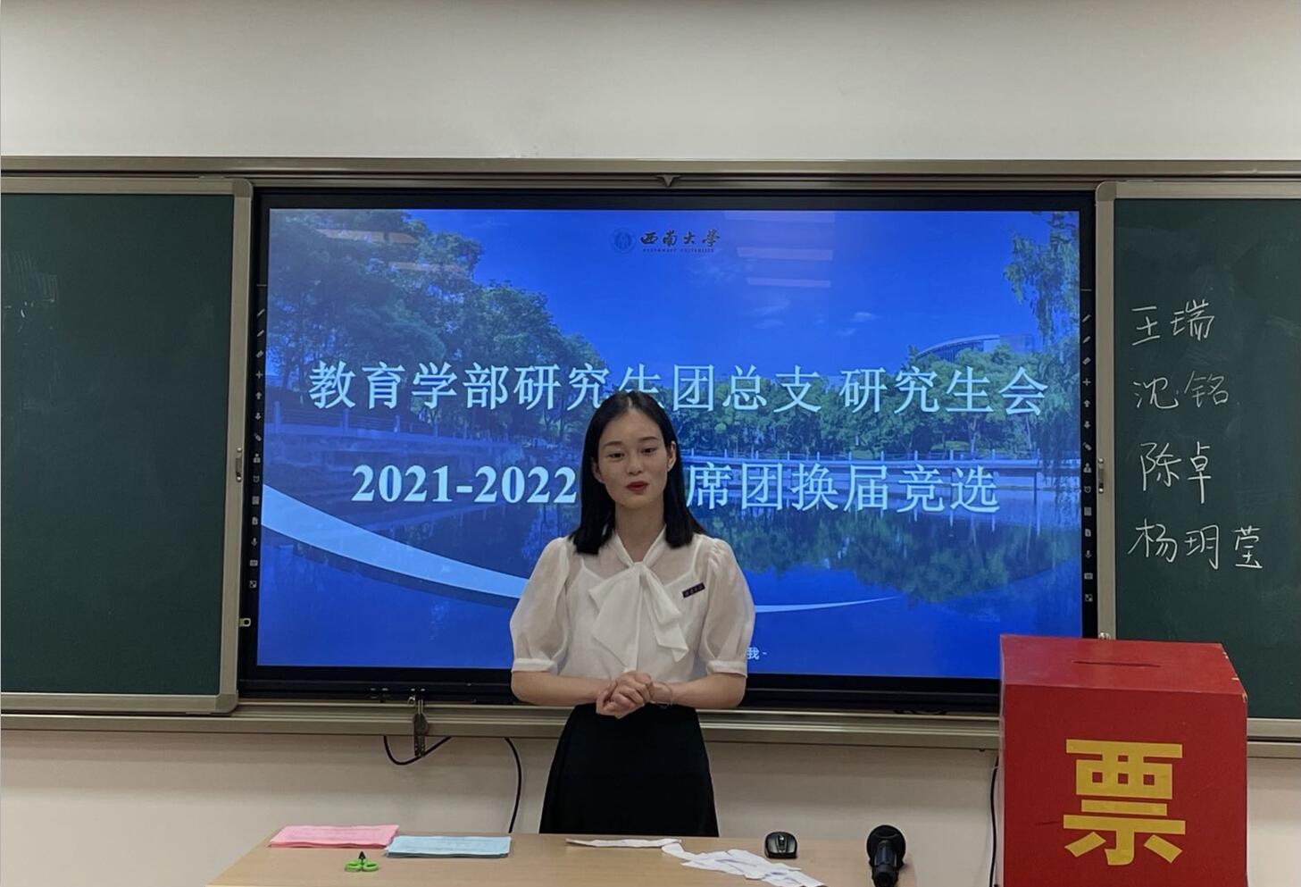 大会进行第三项议程,西南大学必赢3003no1线路检测中心研究生团总支研究生会2021-2022 届主席团开始换届竞选。本次主席团候选人员有陈卓、王瑞、沈铭和杨玥莹四位同学。此次竞选流程由自我陈述、即兴演讲、答辩三部分组成。首先,四位候选者进行自我介绍和简易述职,总结了一学期以来的工作,表达了能够胜任今后工作的决心;接着,竞选人随机抽取题目,进行即兴演讲,展现了自己的应变能力和语言表达能力;最后,团总支书记、主席团成员及学生代表现场提问,对候选者进行多方面的考察。
