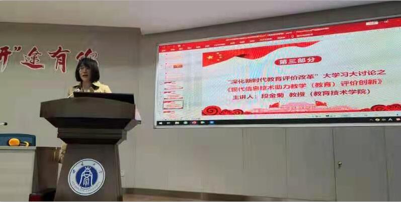 教育技术学院段金菊教授做了题为《现代信息技术助力教学(教育)评价创新》的发言,她从人工智能和大数据等在现代教育技术中的运用,为新时代教育评价制度、体系的创新提供可行性进行了探讨。