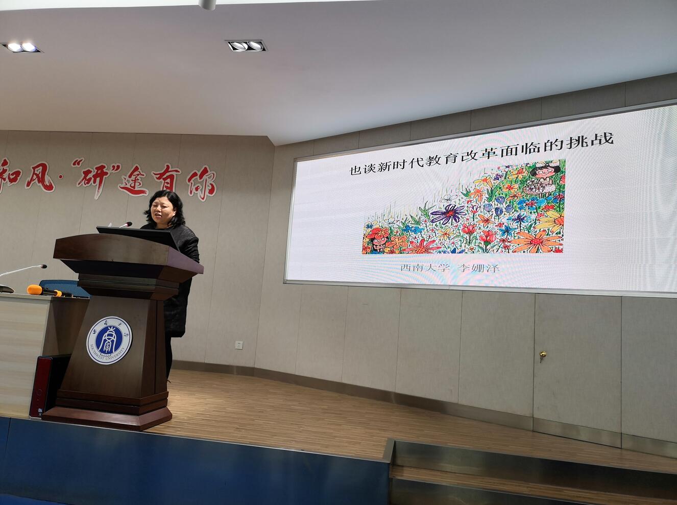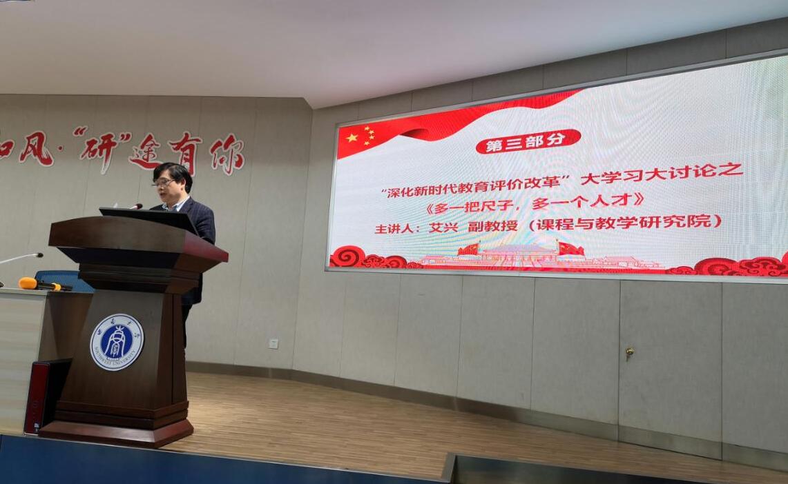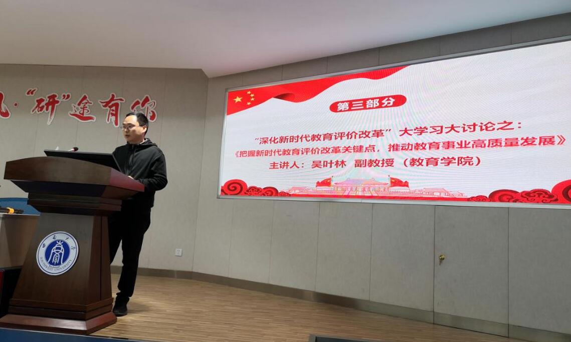教育学院吴叶林副教授做了题为把握新时代教育评价改革关键点,推动教育事业高质量发展》的发言,以科研分类评价的完善为导引,终端倒推本科教育教学,提出了促进高等教育高质量发展的思路。