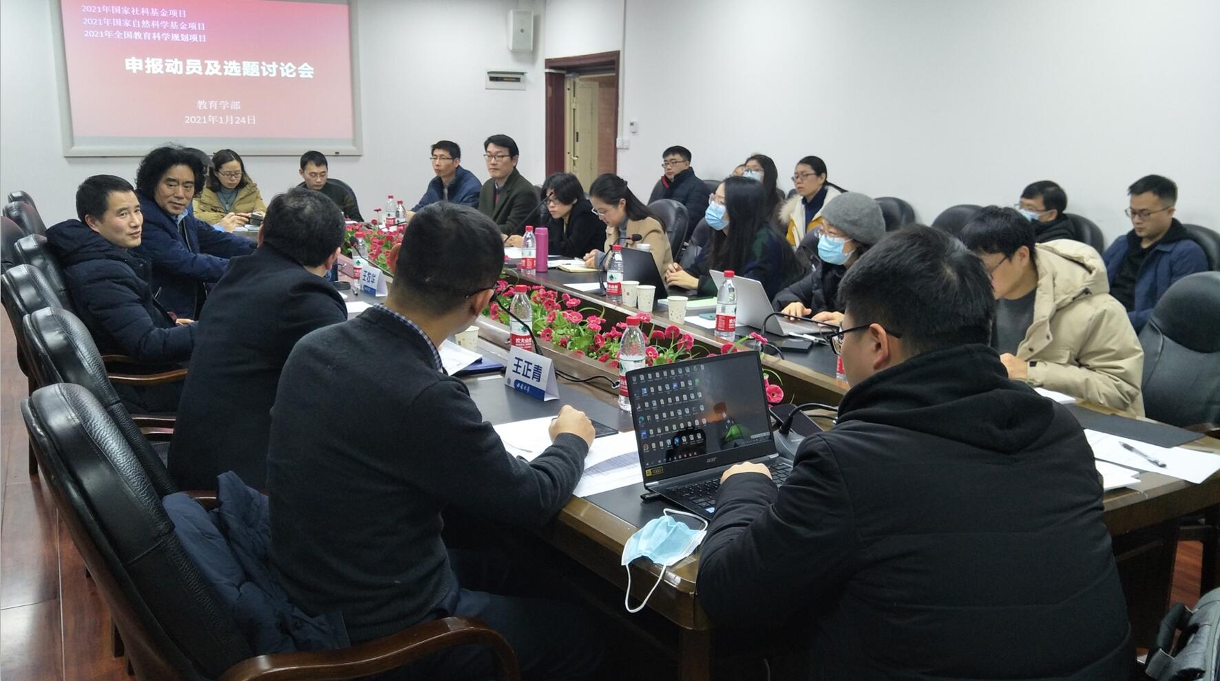 2021年1月24日上午,西南大学必赢3003no1线路检测中心在田家炳403会议室举行了申报国家社科基金项目、国家自然科学基金项目、全国教育科学规划项目动员暨选题讨论会。会议由学部副部长罗生全教授主持,会议特邀经济管理学院王志章教授作为指导专家。参会人员有社科处徐中仁副处长,学部党委书记王牧华教授、副部长王正青教授,李姗泽教授、钟婉娟副教授、艾兴副教授、张振改副教授、姚琳副教授、李欢副教授、韦吉飞副教授、郑鑫副教授、易全勇、杜楠、李军、 袁明宝、张艺英等老师,位涛博士后以及15位研究生总共近40人。