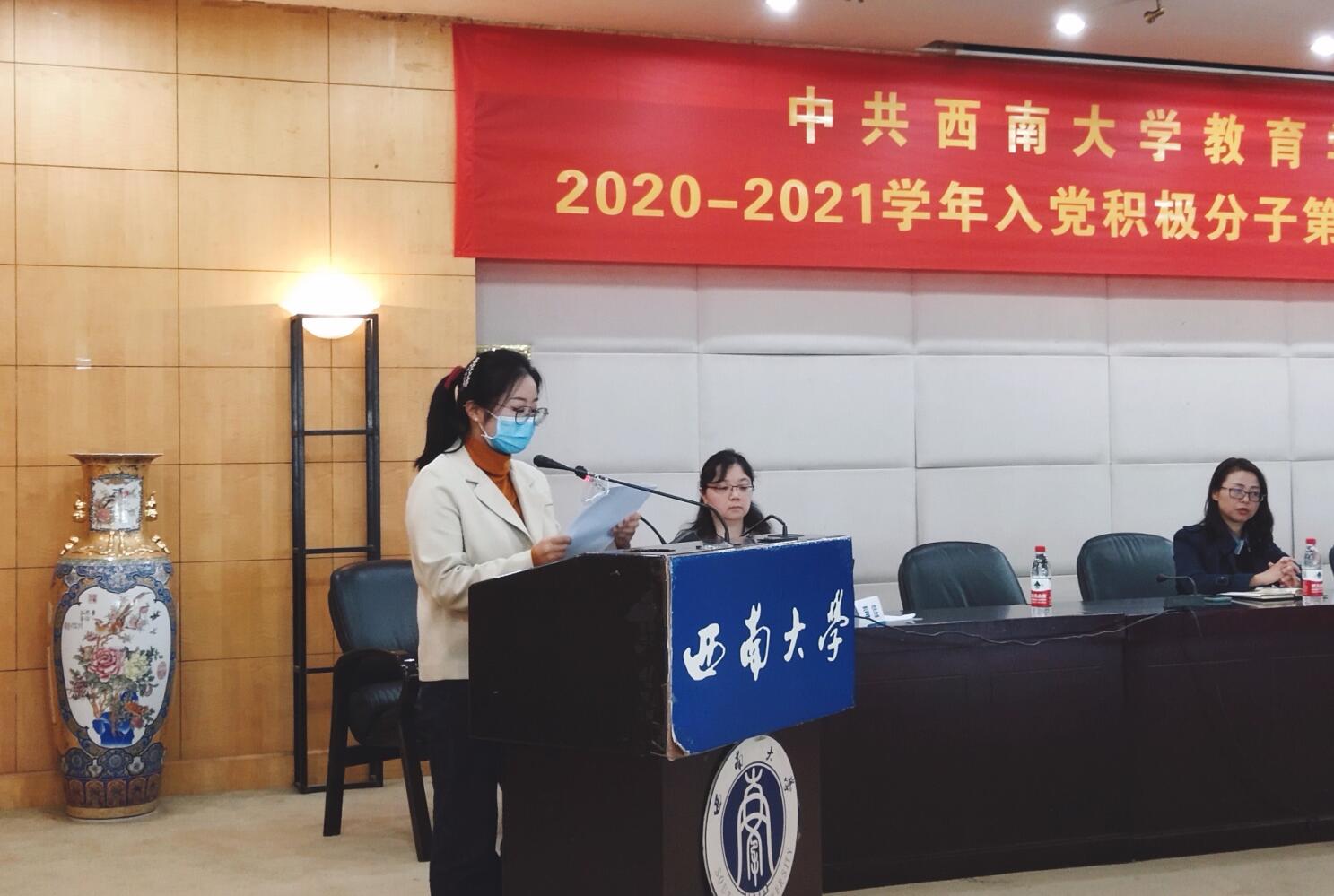 接着,学员代表2020级教育经济与管理专业硕士研究生徐雅玲进行了发言,她表达了早日加入中国共产党,在党组织的带领下发挥更大的作用的深切愿望,并号召通过入党积极分子培训端正入党动机,牢记党的宗旨在党的领导下和学部的培养下,认真学好知识,扎实增强才干,成为有理想,有担当,有作为的21世纪的新青年,争取以实际行动早日加入党组织,为我国教育事业的发展,实现教育现代化作出积极的努力!