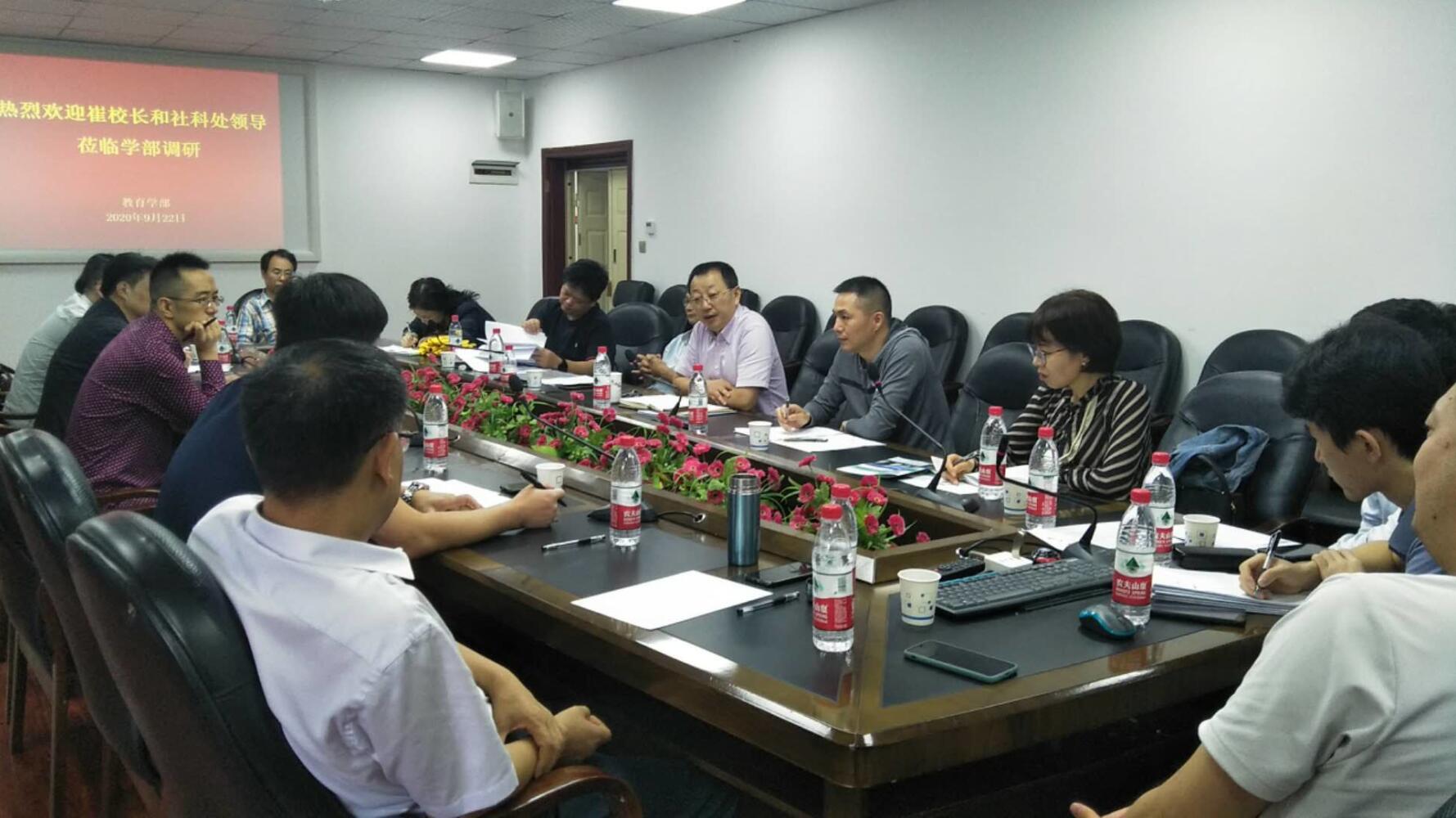 2020年9月22日上午,西南大学崔延强副校长率领社科处邱江处长、徐中仁副处长、范德臣科长一行来学部调研科研工作开展情况及科研平台运转状况。必赢3003no1线路检测中心朱德全部长、罗生全副部长,美育研究中心主任赵伶俐教授、劳动教育研究院主任孙振东教授、教育政策研究所所长李玲教授、教育科学研究所所长谢长法教授,以及西南民族教育与心理研究中心主任张学敏教授、罗江华教授,基础教育研究中心成员陈婷教授、范涌峰研究员、杨欣副教授、罗士琰博士后等,共近20人参加了座谈会。