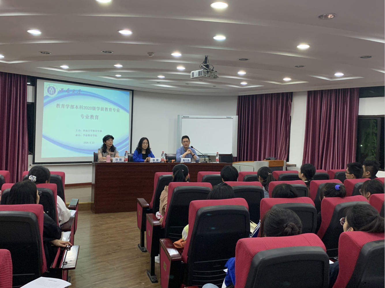 为帮助2020级学前教育专业新生尽快融入大学生活、了解学前教育专业及未来幼儿园教师职业的基本状况,学部于9月23日晚在田家炳306报告厅举行本科学前教育专业教育会。学前教育学院院长李静教授,常务副院长胥兴春副教授,西南大学学前教育专业2005届毕业生、重庆市江北新村幼教集团保教主任刘娟,20级辅导员、学前教育1、2班班主任,以及20级学前教育专业全体同学参加了专业教育会。