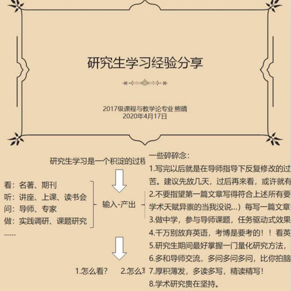 在就业分享环节,2017级高等教育学专业的刘丹分享了自己应聘辅导员的经验,依照“WHW原则“出发,介绍了辅导员是什么、为何做辅导员以及如何备考。2017级课程与教学论专业的谢树勤和2018级小学教育专业的贾梦颖分别分享自己成为小学教师的经验。谢树勤首先介绍了自己的情况,之后就简历的完善和攥写、材料准备以及如何在招聘率仅为1.5%的情况下提升自己的竞争力进行了详细的讲解。贾梦颖为大家就分享了自己在招聘所做的前期和后期准备,并提出了自己的建议。2017级课程与教学论专业的熊晴从如何看论文和如何写论文两方面入手为大家的研究生学习指点迷津。