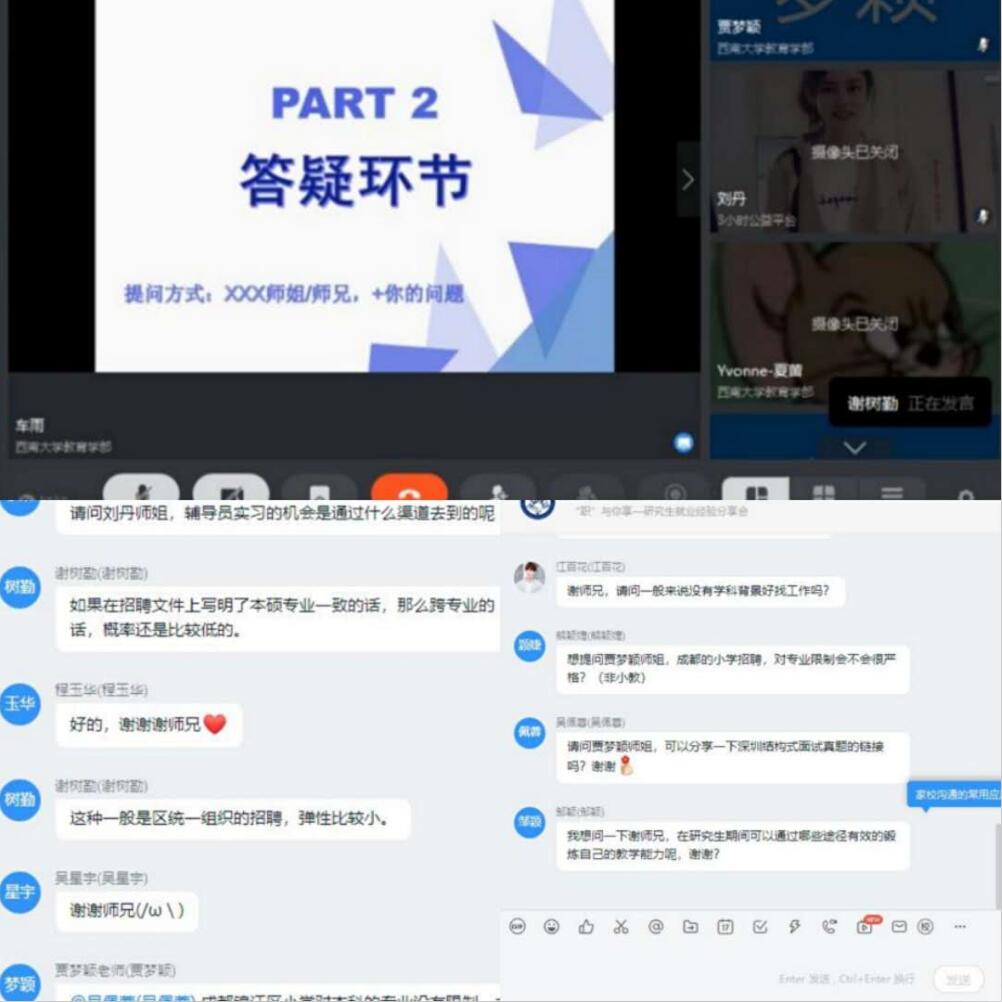 出席活动的嘉宾有2017级高等教育学专业的刘丹、2017级课程与教学论专业的谢树勤、2018级小学教育专业的贾梦颖和2017级课程与教学论专业的熊晴。活动由研究生会秘书处干事车雨主持。学部2018级和2019级研究生以及对就业招聘存在疑问的部分2017级研究生参加了在线分享会。