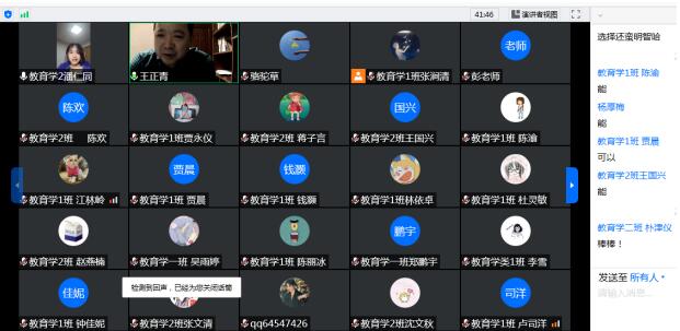 为做好2019级教育学大类招生专业分流工作,激发学生的专业学习兴趣,强化和培养学生的专业意识,2020年5月14日晚上7:00至10:00,学部召开了2019级教育学大类招生专业分流交流暨专业意识教育会,学部彭泽平副部长、学部教育学院么加利院长、王正青副院长、教育技术学院刘革平院长、余亮副院长、邓晖副院长、班主任徐龙博士、韩继宁博士、学部本科教育办公室胡熔老师及2019级教育学大类专业全体学生共62人参与了本次教育学大类招生专业分流师生交流暨专业意识教育视频会。