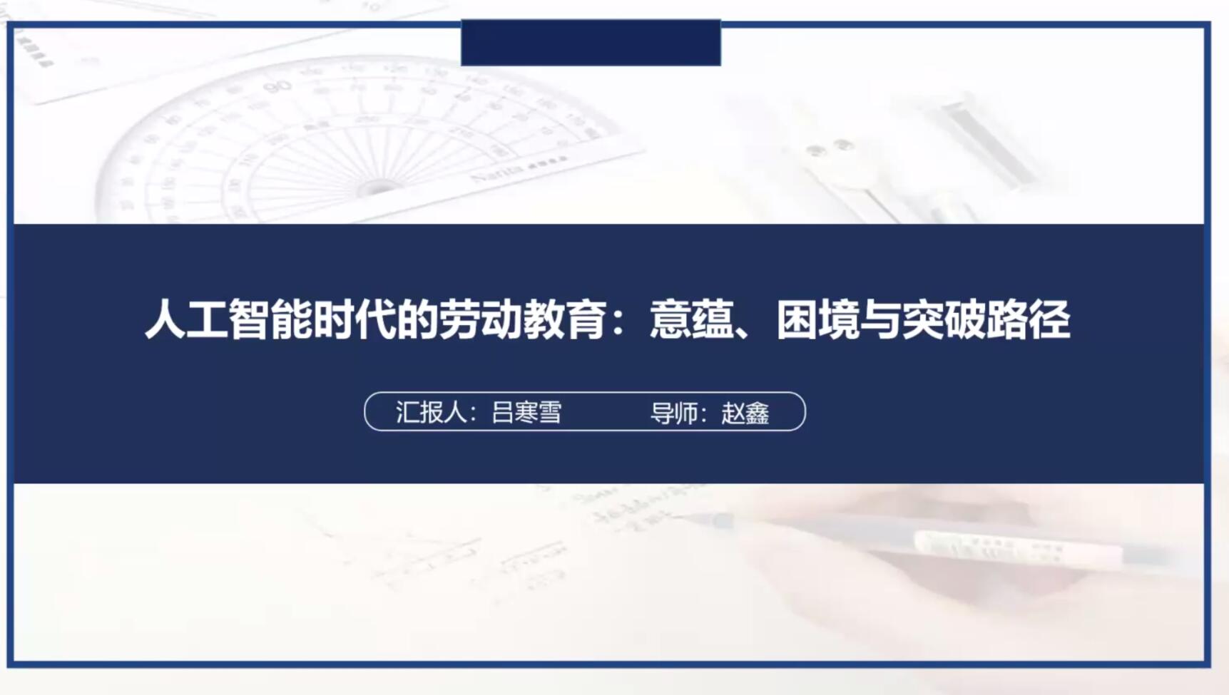 吕寒雪同学就《人工智能时代的劳动教育:意蕴、困境于突破路径》为题展开自己的学术报告。她在汇报中指出,探寻人工智能时代背景下劳动教育的新意蕴,深入分析劳动教育所处的时代困境,寻求劳动教育未来的发展路向,对回应时代发展的劳动素质要求和劳动人才需要有着重要意义。