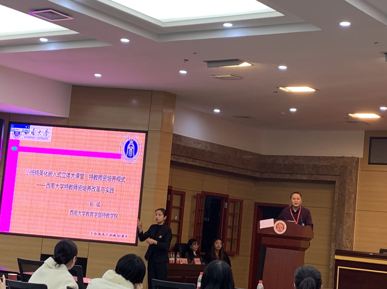 在12月14日下午的三场分论坛,来自不同院校的专家、学者齐聚一堂,围绕师范教育研究、残疾人高等教育研究和综合研究三个分论坛主题,分享各自的研究成果、激发了热烈讨论。赵斌副教授在分论坛一作了《“小班精英化嵌入式立体大课堂”特教师资培养模式--西南大学特教师资培养改革与实践》的报告。