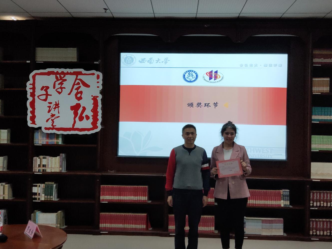 2019级教育经济与管理硕士研究生迪丽呼玛尔▪艾孜孜作品《塞外江南——新疆▪伊犁》获得一等奖。2018级基础教育学硕士研究生汤立凤作品《小河之滨,嘉园崛起》、2018级教育史硕士研究生曾玉娇作品《“宁愿苦干,不愿苦熬”——“黔江精神”再出发》和2018级课程与教学论硕士研究生谢芬作品《破茧成蝶,醉美苗乡》均获得二等奖。罗生全教授现场为此次民族文化展示活动中的获奖同学们颁奖。