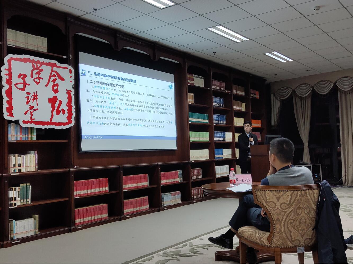 第四位汇报者2018级特殊教育学硕士研究生秦铭欢汇报了《新中国七十年特殊教育发展:成就、困境与走向》。他从发展历程、成就、困境与走向四方面介绍了我国特殊教育的70年,并对新时代中国特殊教育发展走向进行展望。