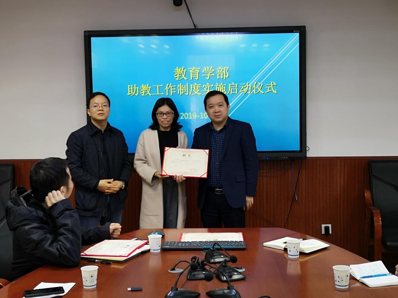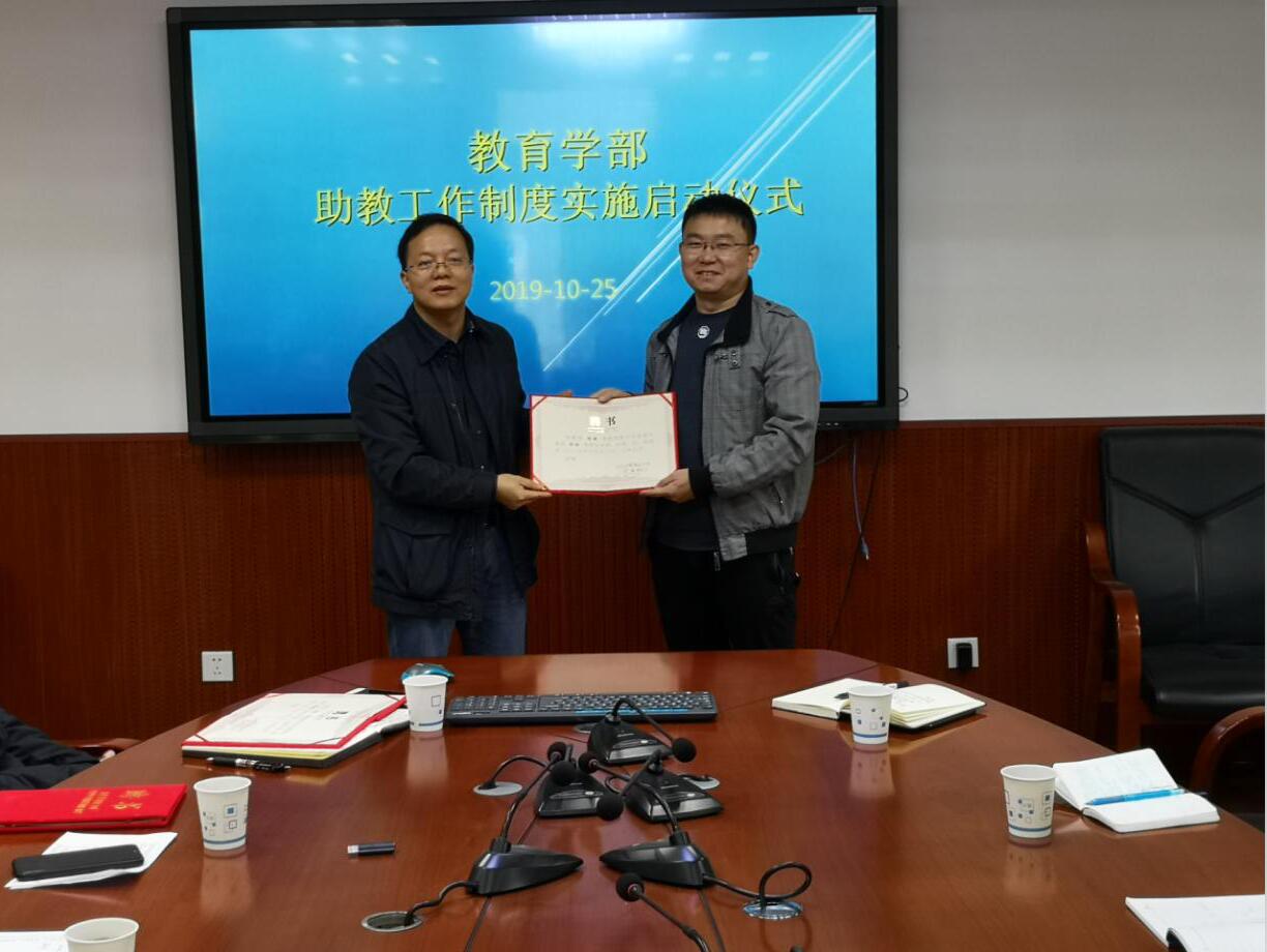 在启动仪式上,副部长彭泽平教授首先从助教制度的宗旨、目标、助教工作基本任务、助教指导教师的职责、助教工作的考核、助教工作的管理几方面介绍了学部的助教工作方案;之后,彭泽平教授代表学部对助教指导教师发放了助教指导教师聘书。
