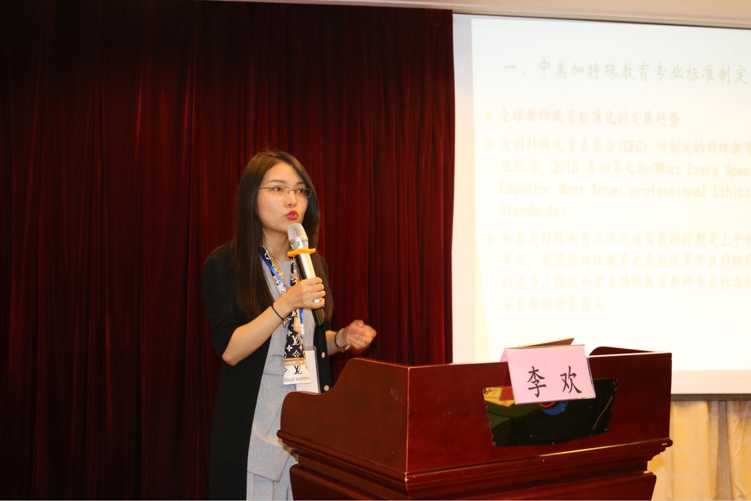 围绕以上问题,大会上各位专家学者进行了深入探讨与交流。赵斌副教授和李欢副教授分别以《我国特殊教育本科专业的办学的现状、问题及反思》和《中美加特殊教育教师专业标准的比较研究》进行大会发言,引起了与会学者的积极探讨与交流。