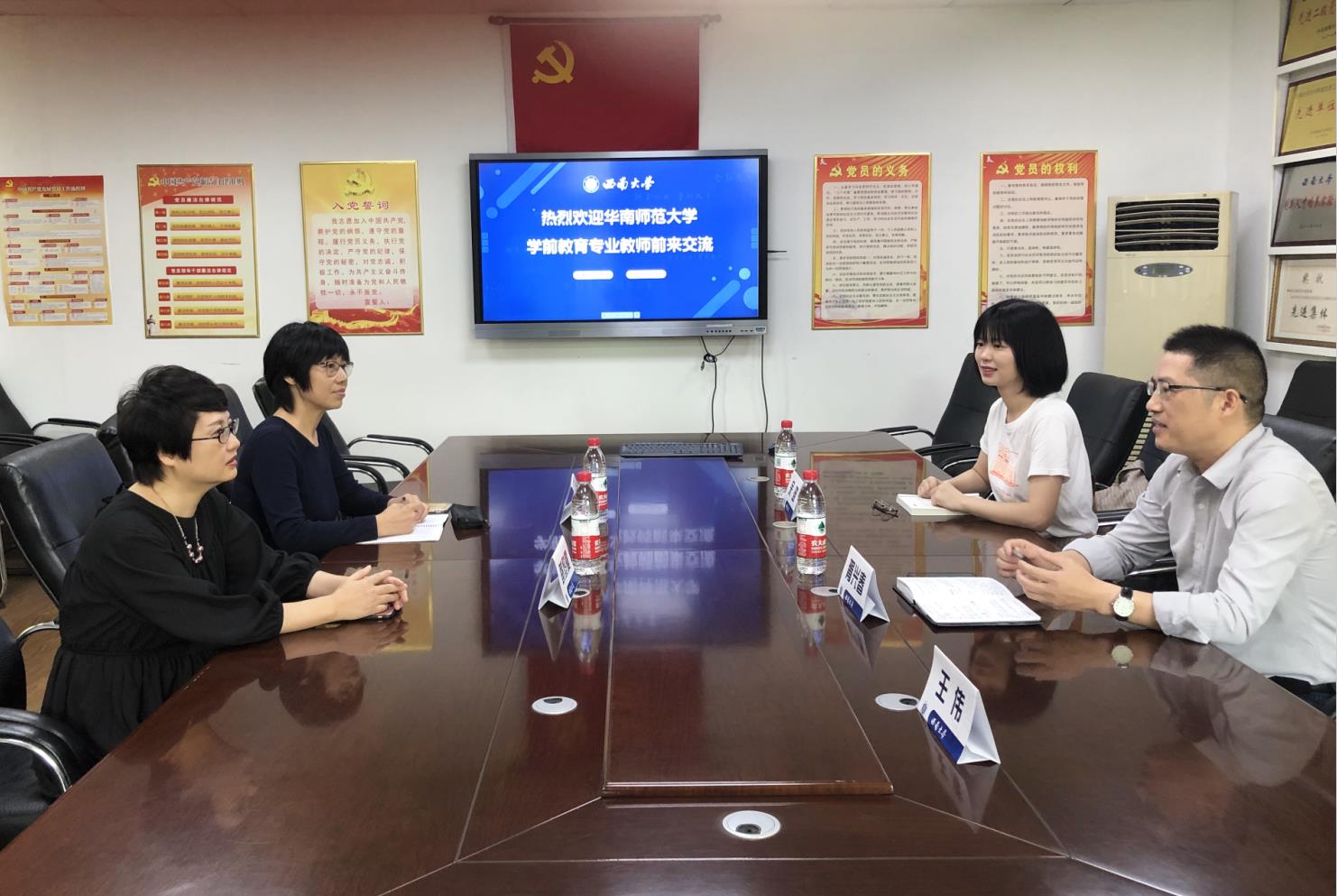 2019年9月23日上午,华南师范大学教育科学学院学前教育系专任教师蔡黎曼副教授、李群副教授,到访必赢3003no1线路检测中心交流考察。必赢3003no1线路检测中心党委书记、部长朱德全教授,学前教育学院副院长胥兴春副教授,学前教育学院王伟博士、余璐博士,接待来宾并参加了座谈会。