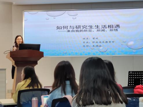 紧接着,曾欢、段晓彤等几位优秀研究代表结合自身经历分享了她们的经验。18级职业技术教育学博士曾欢主要以“如何与研究生生活相遇”为题,讲述了在就读研究生时需要注意的“做”、“听”、“读”、“看”等学习方式方法。17级课程与教学论硕士段晓彤则是重点分享了她在繁多的学生工作与学术任务上采用的时间管理方法,也提出了文件管理、及时记录等学习中的小技巧。17级职业技术教育学硕士李欢讲述了出国交流与实习的经历,也鼓励大家多多争取,借助学部的平台不断开阔视野,塑造自己。18级小学教育硕士王微从专硕的角度出发,分享了实习中的见闻与心得,也从面试经历中提取经验,为大家提供了就业方面的参考。最后研究生会社会实践部部长郭晓红向大家介绍了学部研究生的社会实践项目,建议大家在学习之余深入实践,在实践中体会理论、锻炼技能,进而在实践中发现问题、解决问题,以提高研究能力。