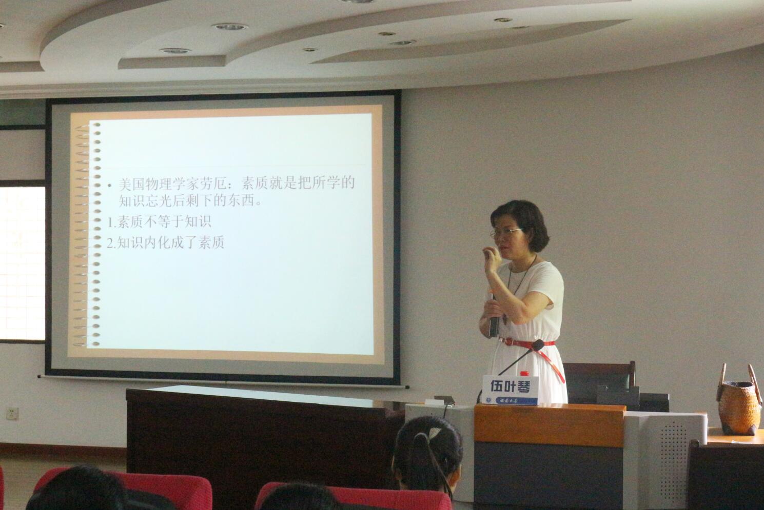 2019年9月9日下午,为引导必赢3003no1线路检测中心本科2019级新生尽快适应大学生活,做有理想、有素养的优秀大学生。由学部伍叶琴副教授主讲的西南大学必赢3003no1线路检测中心入学教育系列讲座之《做一个有教养的人》在田家炳教育书院306报告厅开展。