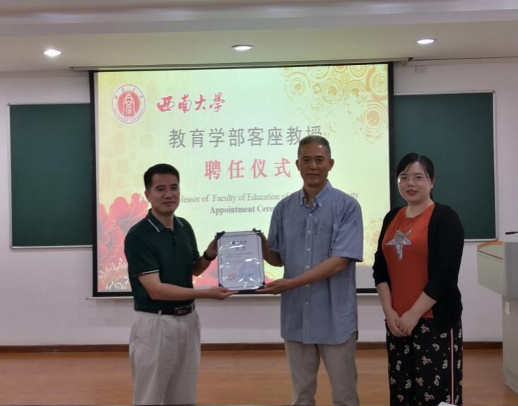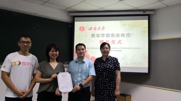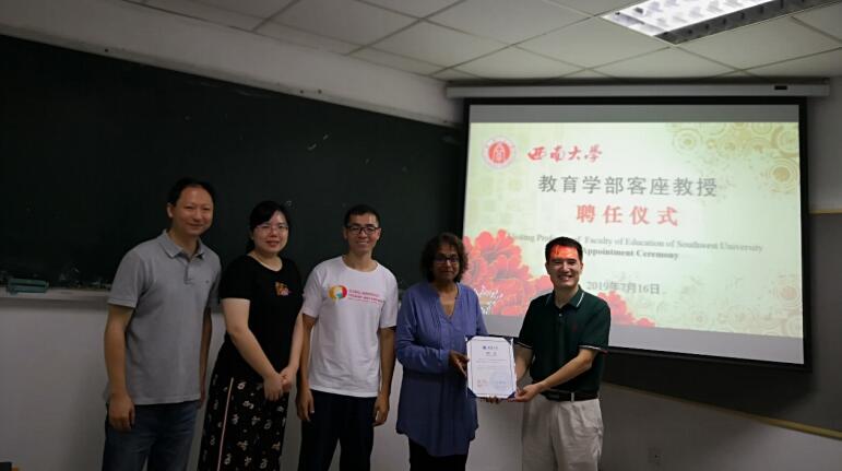 在国际课程周期间,经学校评审,Li Cao教授、Kumari K. Beck副教授和Zhihua Zhang副教授获聘西南大学客座教授。学部为三位老师举行了简短而隆重的聘任仪式,王牧华副部长分别为三位老师颁发了聘书,感谢三位老师对国际课程的支持与付出,并希望能由此进一步开展多方面的合作。三位老师感谢学校和学部对他们的重视与信任,纷纷表示会尽自己之力支持学部的国际化工作,也希望作为桥梁推动学部与他们学校的进一步合作。