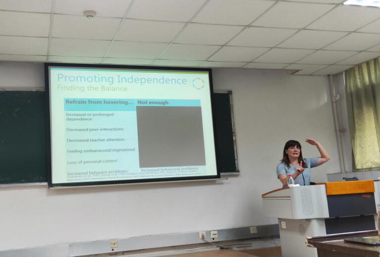 经过一系列的“课前热身”活动,接下来Randolph教授为同学们带来了以《独立的教学技巧:适应行为和执行能力(Teaching Skills for Independence:Adaptive Behavior & Executive Functioning)》为主题的讲座,她以自闭症未来独立的重要性引入,并围绕促进独立(promoting independence)、视觉支持(Visual Supports)、适应行为(Adaptive Behaviors)、执行功能(Executive Functioning)等几方面展开了详细的介绍。她强调,增加自闭症儿童的独立性是为了减少他们未来成年后对他人的依赖,不论是对自闭症个人还是他们的家庭都具有非常重要的意义。为了更好地促进自闭症孩子们的独立,需要借助支持性的工具。Randolph教授以自己为例,说明支持性工具对于个体的生活和发展的重要性。其中,视觉支持作为重要的支持性工具之一,在自闭症的教学中起到一定的作用。Randolph教授也介绍了许多在日常教学和生活中给予自闭症儿童视觉支持的例子。紧接着,Randolph教授又介绍了执行功能的概念并指出自闭症在认知、情感和行为这三个方面的缺陷。此外,教授还就有关问题解决(Problem Solving)的教学给出三步解决法,首先是环顾四周看自己是否能够解决,其次是向同伴或社区成员寻求帮助,最后才是向父母、老师或其他人寻求帮助。最后Randolph教授指出,自闭症儿童的独立是一个非常艰巨和困难的过程,需要家长、教师和个体共同努力。