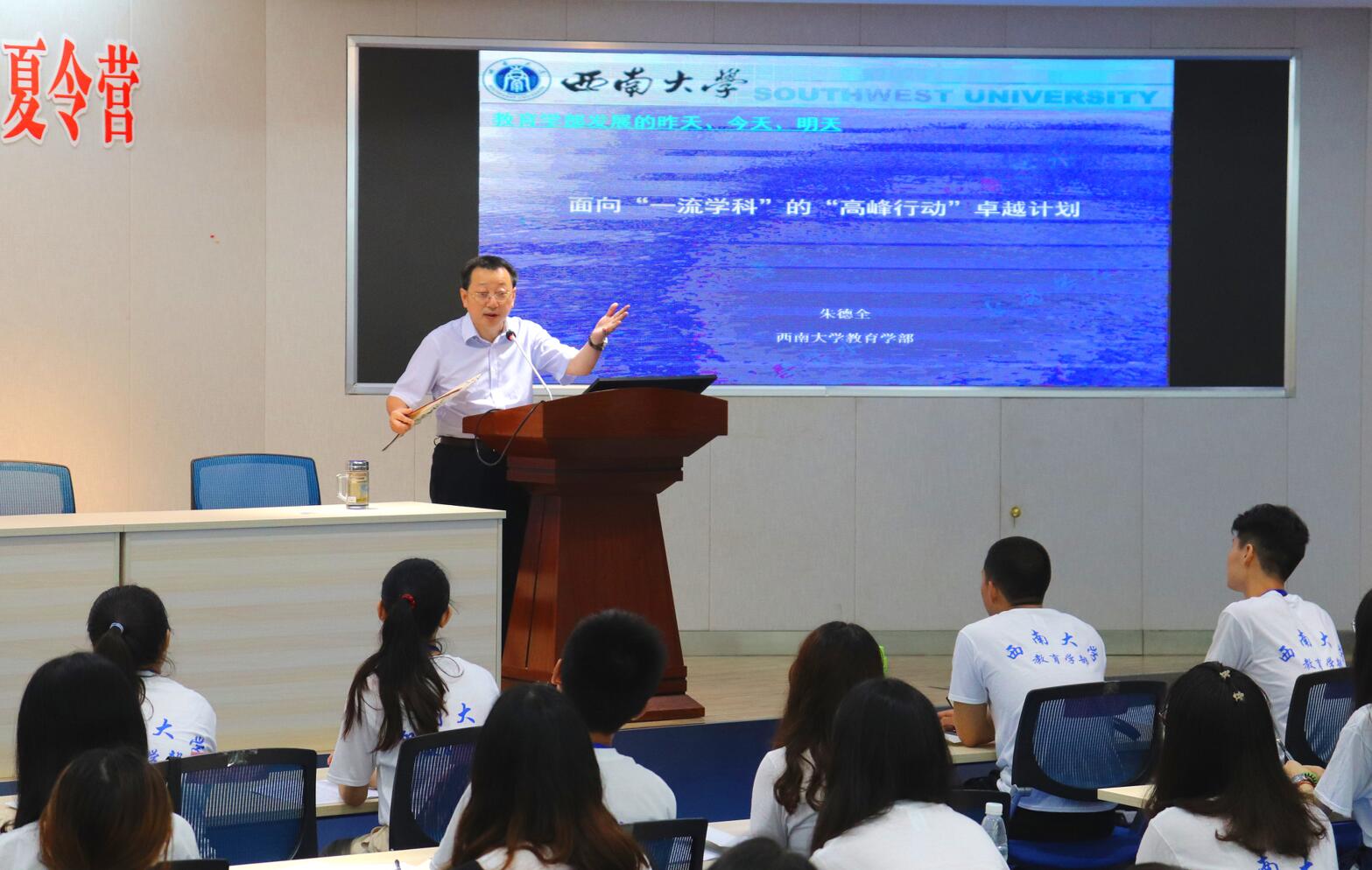 夏令营启动仪式后,朱德全书记以“一高两多三好四特别”系统概括了报考西南大学必赢3003no1线路检测中心研究生的优势,并欢迎全体夏令营营员报考西南大学,走进必赢3003no1线路检测中心。随后,朱书记以“昨天已登上高山、今天正走过高原、明天将爬上高峰”为主线,详细介绍了西南大学教育学和必赢3003no1线路检测中心的发展历史和现状,系统阐释了必赢3003no1线路检测中心的愿景、部训、精神、教风和学风,并介绍了必赢3003no1线路检测中心研究生培养“卓越行动计划”。朱书记指出,必赢3003no1线路检测中心及教育学科的发展将秉持“自强不行、卓越前行”的精神,在顶层设计与底层跟进中追求卓越,全力推进教育学“团队、项目、领域、成果、人才、平台”等方面的深入发展,把教育学一流学科建设推向前进。