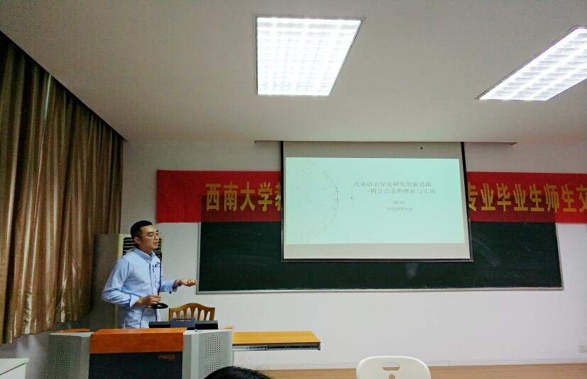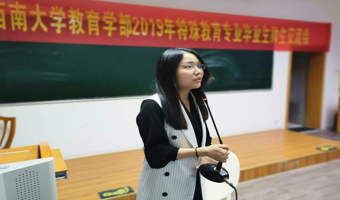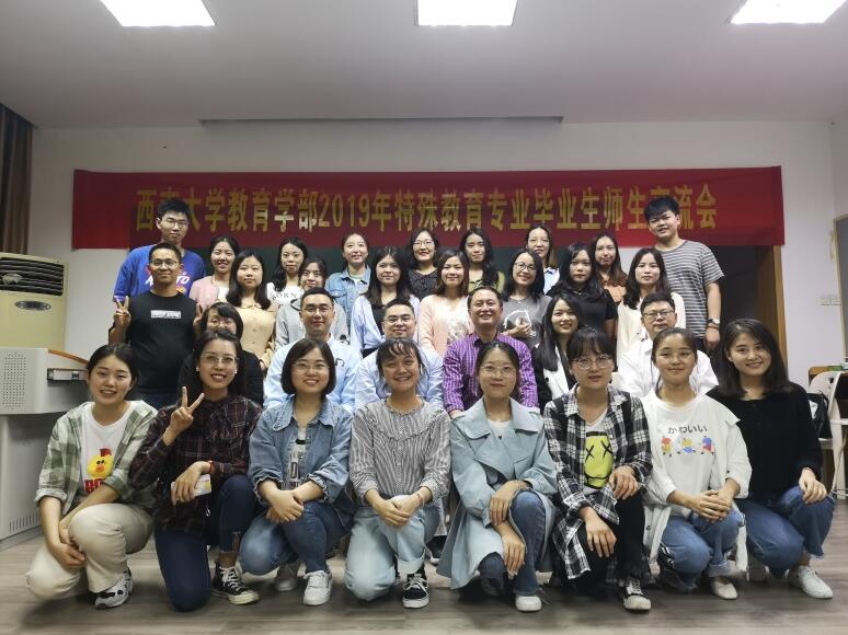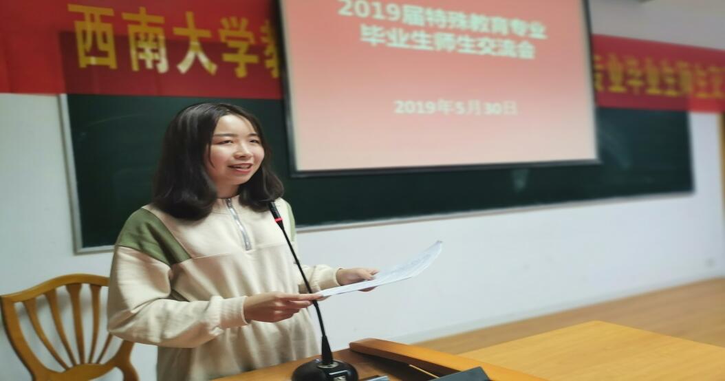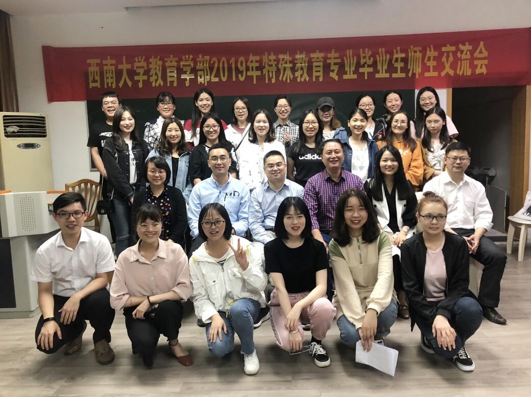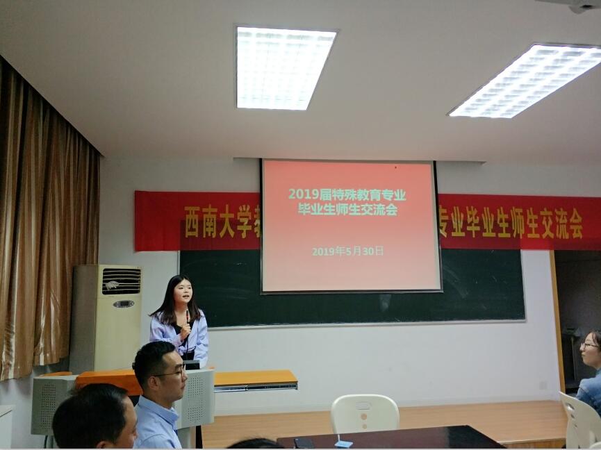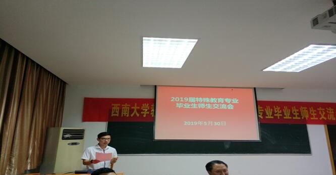 2019年5月30晚7点,西南大学必赢3003no1线路检测中心2019年特殊教育专业毕业生师生交流会在田家炳教学楼711教室如期举行。莅临本次交流会的嘉宾有必赢3003no1线路检测中心党委副书记王华敏教授、特殊教育学院院长赵斌副教授、特殊教育学院副院长李欢副教授、杨柳副教授和阳泽副教授,以及交流分享嘉宾---徐帅博士。2019届特殊教育专业的研究生和本科生以及特殊教育学院研一、研二的学生也全部到场。
