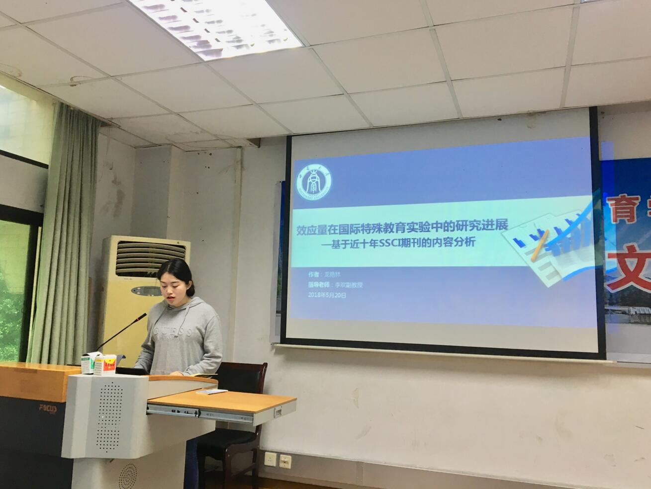 其次,特殊教育专业龙艳林同学作了题为《效应量在国际特殊教育实验中的研究进展——基于近十年SSCI期刊的内容分析》的学术分享。为了梳理国际特殊教育实验中效应量的研究进展,龙艳林同学从SSCI来源的40份特殊教育期刊中检索了近十年有关实验效应量的研究,从纳入文献的数量、研究设计、效应量的应用等方面进行内容分析。在结合前人对效应量分类的基础上,她将所使用的效应量指标分为基于目视分析的效应量和基于统计分析的效应量,并对效应量指标的计算、判断标准以及特点进行深入探究。在此基础上提出:鼓励积极使用效应量指标,增加研究结果解释力等建议。