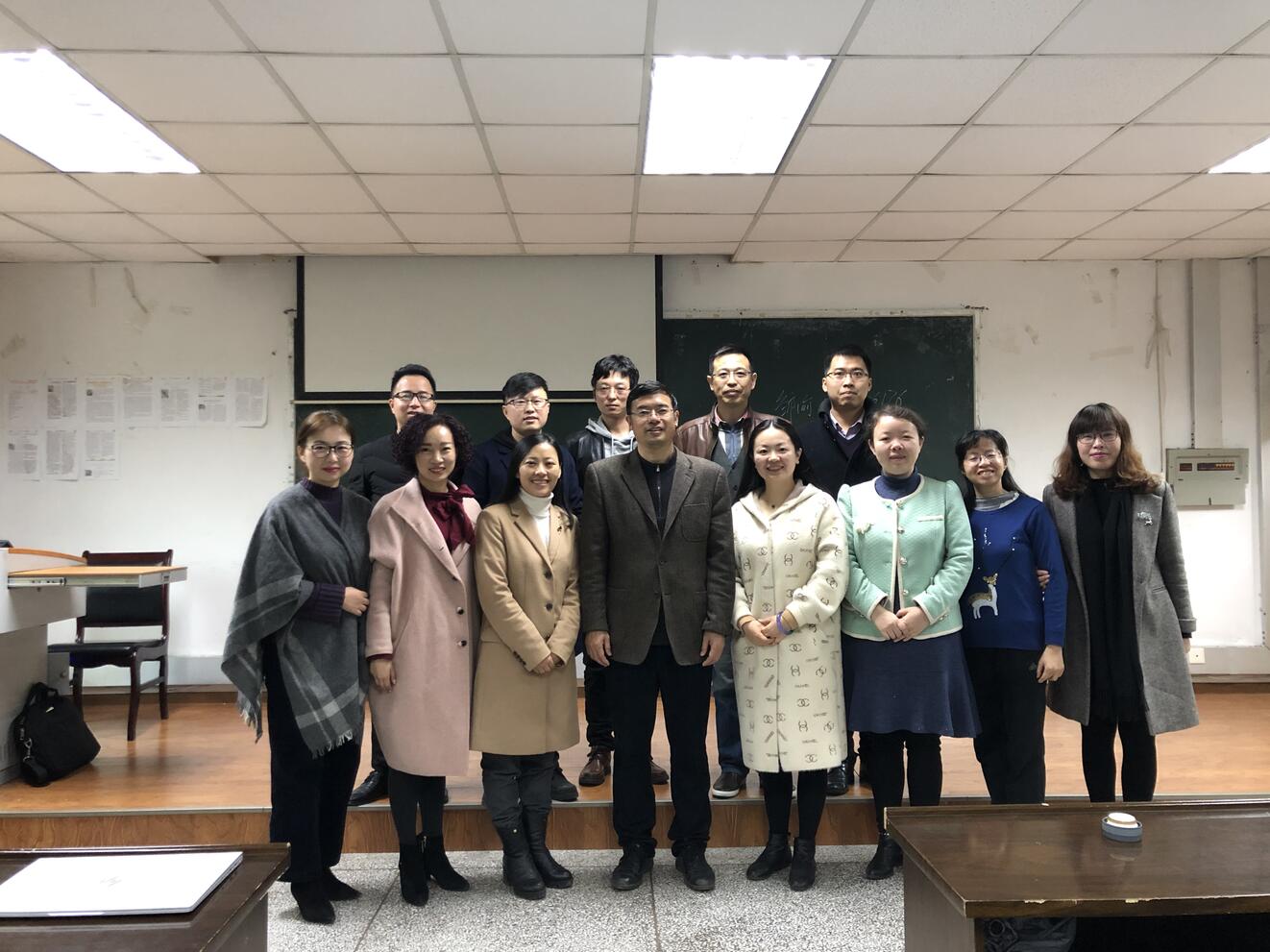 三个小时的讲座很快就结束了,邹渝教授愉快地与教育博士生们合影留念。博士生朱玲、阴红桃、孙倩、李亚勍、卫晋丽、李静、周莹华、涂超、曾令斌、师超、王新华等围着邹渝教授就教育治理与决策的逻辑起点进行深入的交流、探讨,听取邹教授的指点。