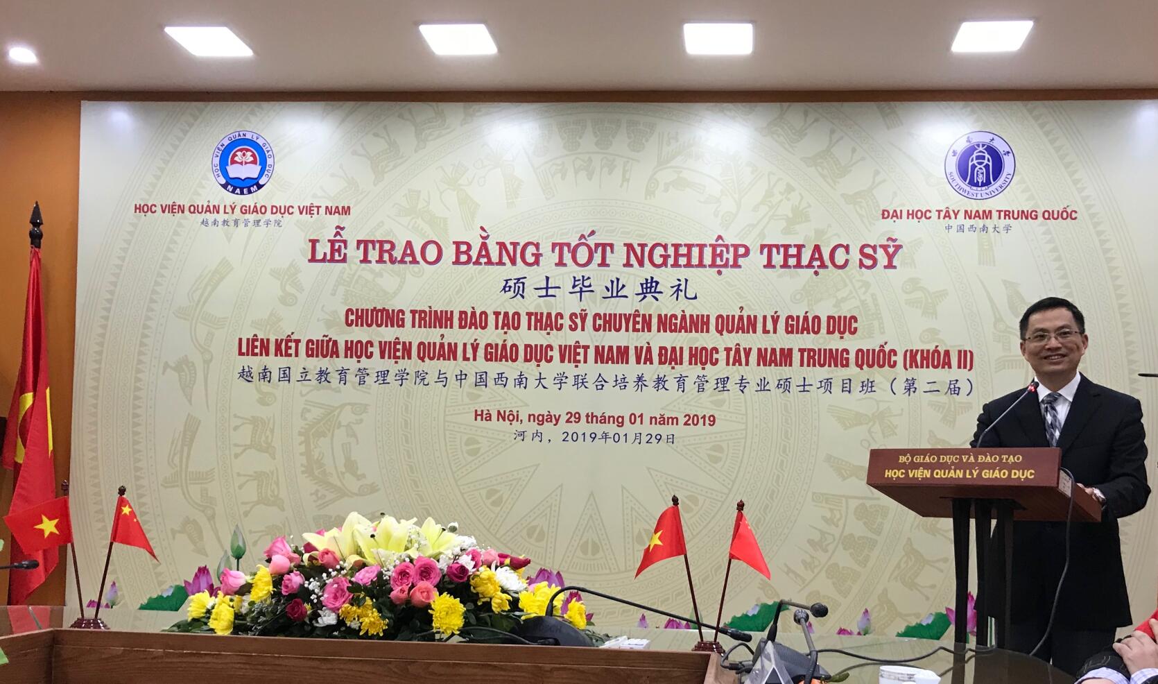 2019年1月29日,在越南国立教育管理学院的盛情邀请下,我校研究生院尹晓东副院长、必赢3003no1线路检测中心罗生全教授、么加利教授、国际部戴华鹏主任,分别代表我校研究生院及必赢3003no1线路检测中心前往越南河内,参加了第二届联合培养教育硕士的毕业典礼及授位仪式。