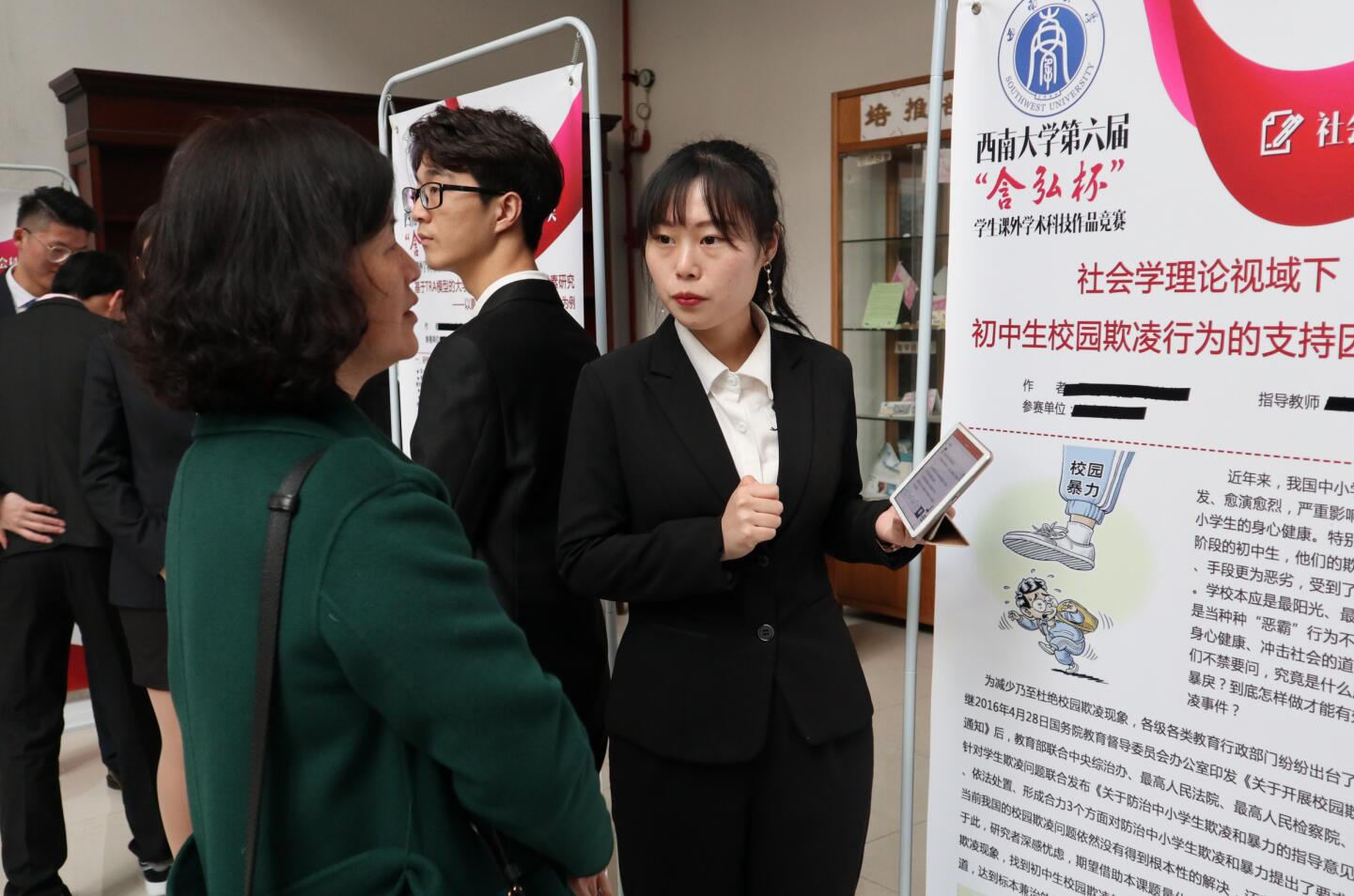 仰观宇宙之大,俯察品类之盛。本次学生学术作品科技竞赛中,参赛作品包括自然科学类学术论文、哲学社会科学类社会调查报告和学术论文、科技发明制作及应用艺术四类。在现场问询过程中,评委老师们综合考虑科学性、先进性、现实性等因素,对参赛作品进行评定。我部成功入围的学术作品在哲学社会科学类脱颖而出:商润泽组《创客教育对初中生核心素养发展影响的实证研究》荣获一等奖;刘乔卉组《基于TRA模型的大学教材使用现状及其影响因素研究——以重庆市普通高等院校文史类专业为例》、罗丽组《社会学理论视域下初中生校园欺凌行为的支持因素研究》、刘璐璐组《“看不见”的教育——40年来我国小学思想品德教材职业观的调查研究》荣获二等奖;王琦琪组《“互联网+”背景下本科生媒介素养测评模型建构与应用研究——以重庆市为例》、沈汝婷组《中国大陆与台湾地区高等融合教育地区发展差异的比较研究——基于K-means聚类与GIS可视化分析》、李晓慧组《大学生低碳素养现状及对策研究——以西南大学为例》、范栖银组《基于城乡小学生学习策略水平差异的教育扶贫启示——以重庆市S小学和N小学为例》和张晓玟组《近十年英汉阅读障碍干预方法的比较研究》荣获三等奖。与此同时,我部取得总分排名第一的优异成绩,“含弘杯”和优秀组织奖实至名归。