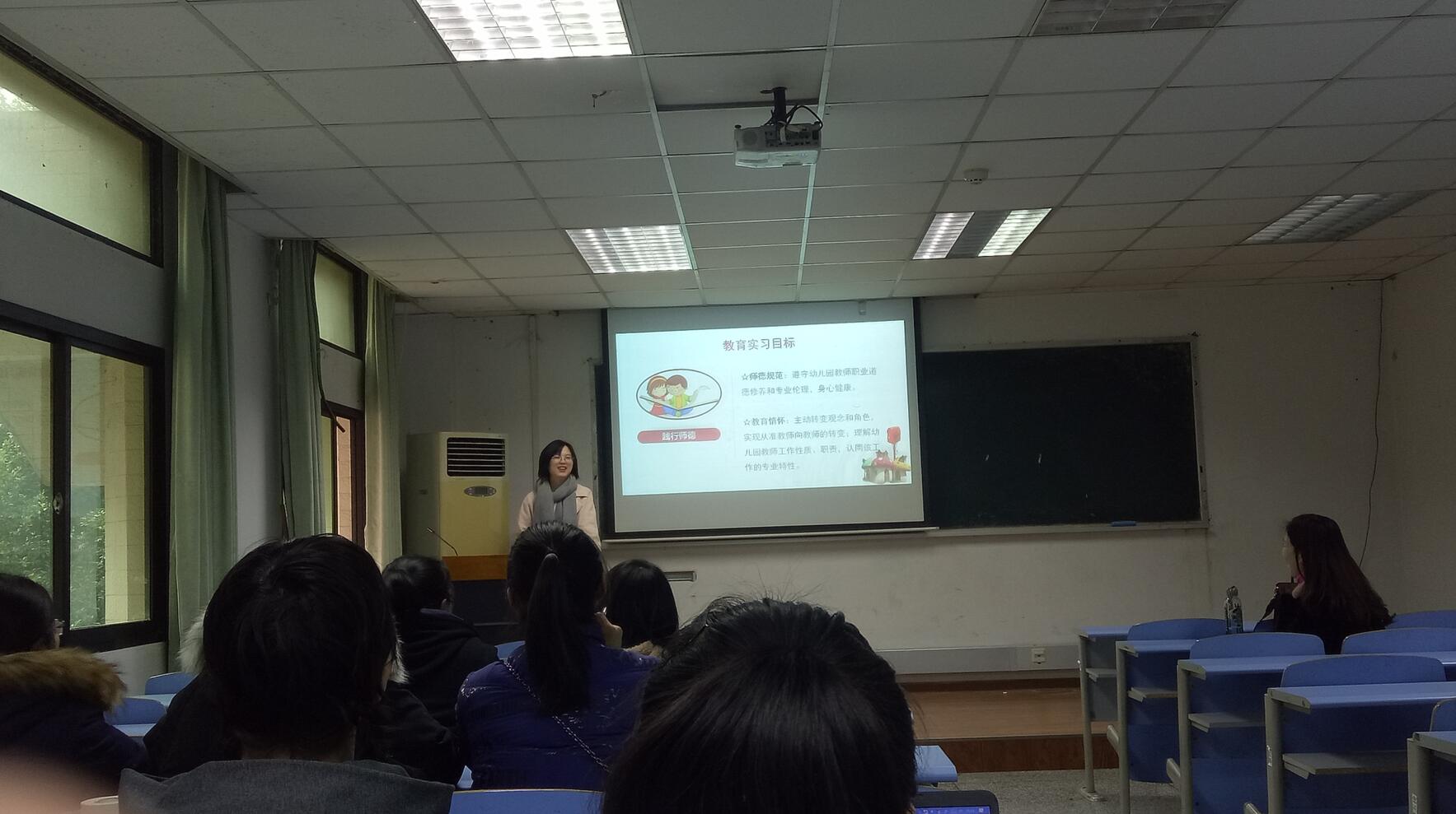 江津和渝北片区实习指导教师胥兴春副教授、渝中片区实习指导教师王伟博士、北碚片区实习指导教师王丹副教授与余璐博士,首先感谢了历年来学部院系、教育实践基地、双方指导教师的大力支持和辛勤付出。接着,从教育实习在培养方案中的设置、实习安排和有关管理规定、实践基地与高校的协同育人机制、实习相关时间节点、体检须知等五个方面,整体性地向同学们介绍了2016级学前教育专业的教育实习安排;同时,也向同学们简要介绍了教育实习和研习的目标,鼓励同学们将实习与研习结合、以反思性实践促进自身专业发展。余璐老师就培养目标、毕业要求、教育实习课程设置三者之间的关系,为同学们进行了详细说明,希望同学们能够通过实习让教育情怀落地、让研究主题萌芽、让保教知识和能力融合。