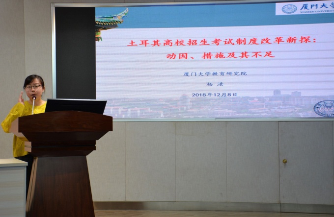 2014届博士毕业生、绵阳师范学院王涛副教授作了题为“‘一带一路’倡议背景下比较教育知识的生成逻辑”的学术汇报。王涛博士认为,“一带一路”的目标是实现利益共同体、责任共同体与命运共同体,而教育是全人类共同核心利益,因此比较教育的知识建构必须淡化“借鉴改革”的思路而指向全人类教育的本体。2005届硕士毕业生、厦门大学在读博士杨滢作了题为“土耳其高校招生考试制度改革新探:动因、措施及其不足”的学术汇报,概括了土耳其高校招生考试制度与我国高考在全国统一性、高竞争性、高利害性、改革性等方面的相似特征,并从政治驱动、经济驱动、文化驱动、质量驱动等方面阐述了土耳其高校招生考试制度改革的未来走向。