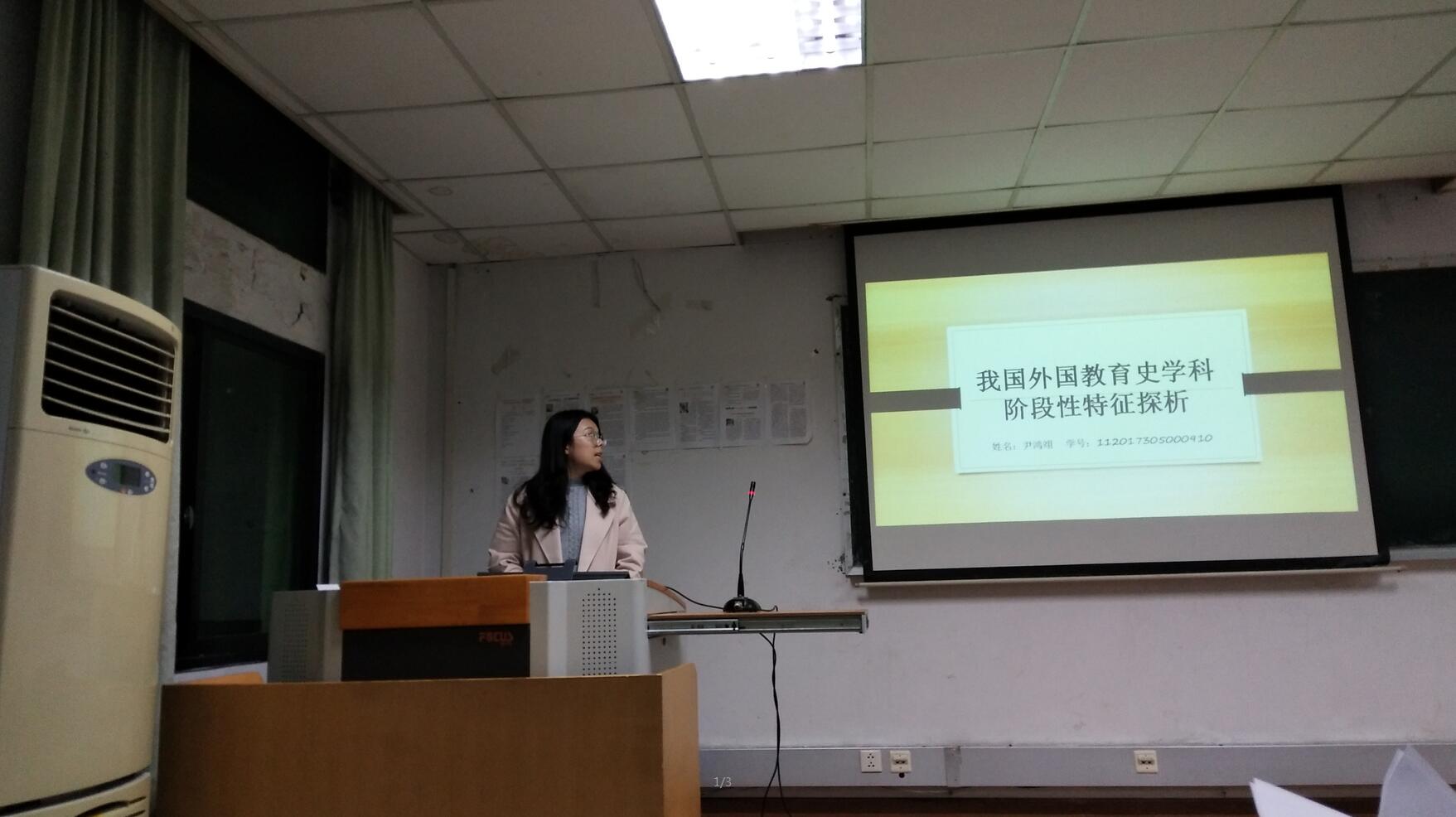 首先,来自教育史专业的尹鸿翊同学就其论文《我国外国教育史学科阶段性特征探析》展开了汇报。通过对外国教育史学科分为形成时期、借鉴吸收时期、重建发展时期,就三个阶段对外国教育史学科发展特征进行了归纳和分析。在尹鸿翊同学个人陈述结束后,现场同学纷纷建言献策。随后杨梅老师从论文的研究目的明确性、时间阶段划分的合理性及阶段特征的总结等方面对该论文提出了建议。