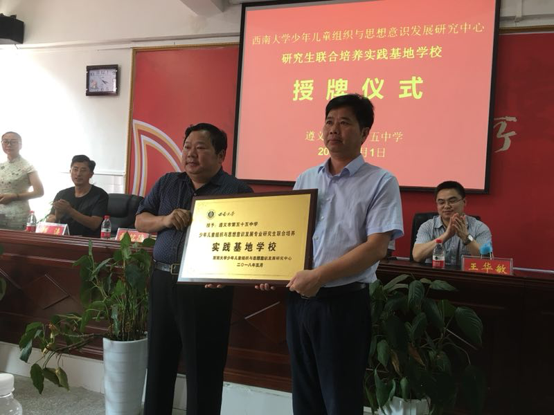 为搭建高层次人才培养平台,进一步提升中心研究生培养质量和学科发展水平,2018年7月1日,西南大学必赢3003no1线路检测中心党委书记韩仁友副研究员、党委副书记王华敏教授、中心主任易连云教授、中心成员张正江副教授及张凌洋副教授一行赴贵州遵义,与遵义市第五十五中学签订了研究生联合培养基地协议,并正式举行了“西南大学少年儿童组织与思想意识发展研究中心研究生联合培养基地学校授牌仪式”。