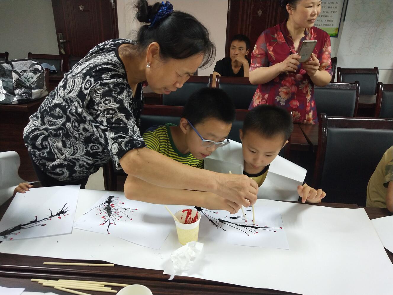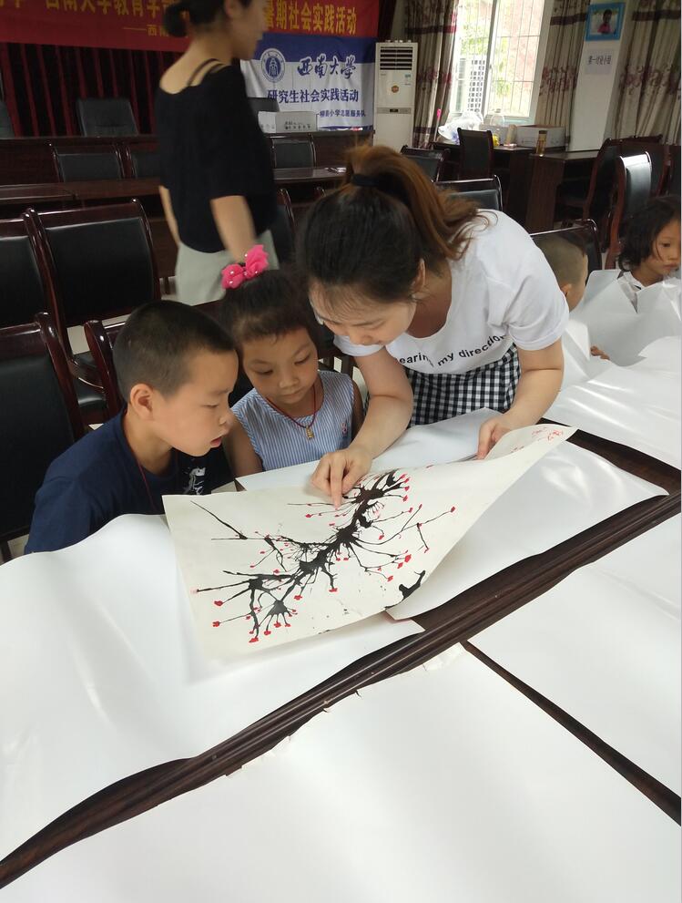 由于活动深受西河村孩子们的喜爱。第二天西南大学必赢3003no1线路检测中心研究生志愿服务团队6位志愿者为麻柳村的孩子们也带去了“吹墨画梅”活动。麻柳河村部分家长也参与到此次活动中,在志愿老师的讲解下,开展了“亲子画梅”体验活动,家长和孩子们一起用心地完成一幅美丽的作品。当一个年幼的孩子画完红梅图,亲自把心爱的作品送到奶奶手上时,奶奶激动得眼泛泪花。