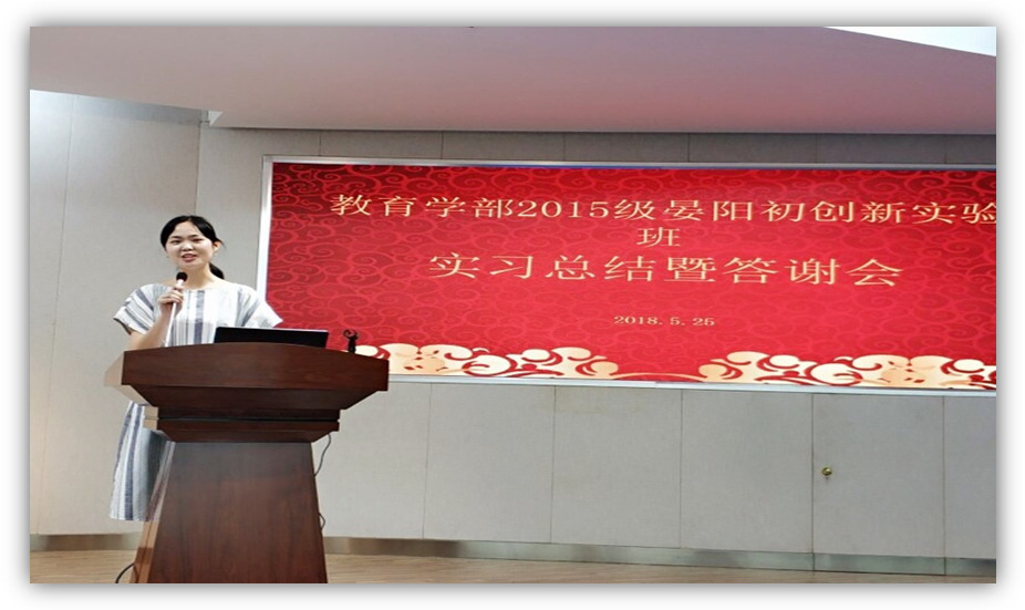 大会首先由罗丽同学代表全体实习生发言,介绍本班实习情况,晏阳初创新实验班42名学生在五个校区完成了为时两个月的实习工作,获得校级优秀实习生4名,实习周报两期,实习科研成果汇总等,取得这样的好成绩要感谢实习学校的各位老师的指导,从只会纸上谈兵的大学生成长为一个能够在教育岗位工作的老师,也感谢学部一直予以支持,尽可能满足每位同学的需求,让同学没有后顾之忧。