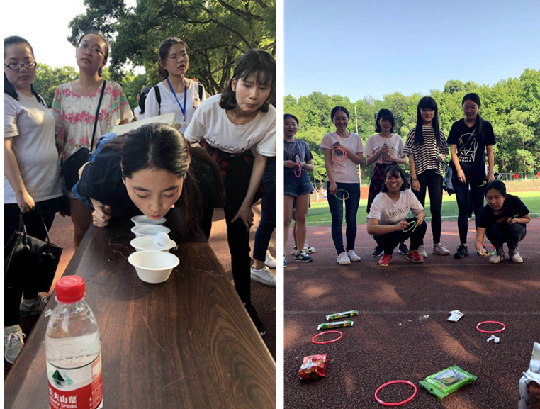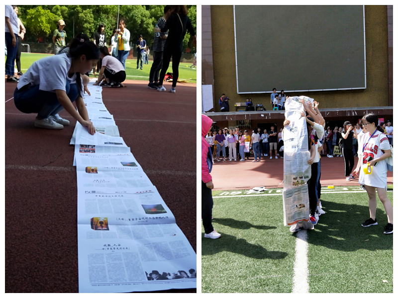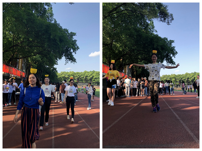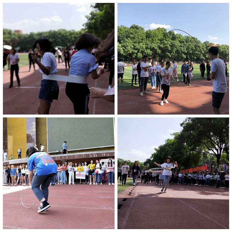 热情洋溢的开场舞之后,迎来了五项集体比赛。首先是激动人心的拔河比赛,种子选手“打完赶紧开派队”VS“天生一队”,每队各两名男生、十三名女生,整体实力相当。经激烈对决,最终“天生一队”以2:0获胜。接着上演“一带一路”,不用手将布条缠身并通过躯干扭动传递至下一名队员,“你转我跟着转”,队员间配合默契。第三项是完美融合“比赛”与“娱乐”功能的“无敌风火轮”——既有比赛的争分夺秒,更有娱乐的捧腹大笑。赛前,各队队员密谋计策、明确分工。随一声哨声,队员合力铺平17张报纸并飞快粘上胶布,制作成大纸圈(“风火轮”);根据身高“排兵布阵”,确定站位后立即向终点移动。驾驶“风火轮”期间,几支队伍报纸破裂,匆忙修补后继续艰难前进,引起场上阵阵笑声。第四项“圆圆圈圈”是行走的铁环和呼啦圈,刷新了观众认知;最后一项“跳大绳”紧张刺激。“1、2、3……”跳绳翻飞,队员一个紧接一个,“跳、走、跳、走……”有节奏、有组织,充分展现了集体智慧与活力。其中,“最强天团”队在赛前进行“无绳演练”,手中无绳心中有绳,赚足了人气和褒扬。