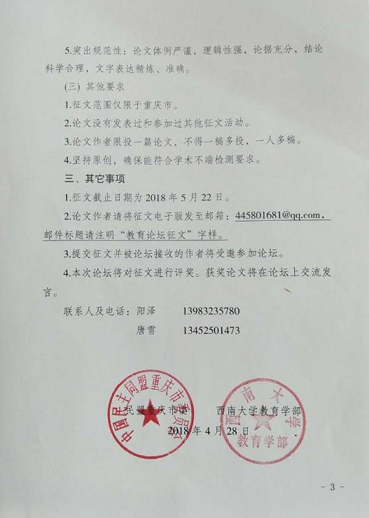 民盟重庆市委拟和西南大学必赢3003no1线路检测中心联合举办以教育供给侧改革为主题的教育论坛,现向各位老师和同学征集论坛征文,欢迎大家积极投稿,征文截止日期为2018年5月22日。详情请见征文通知。