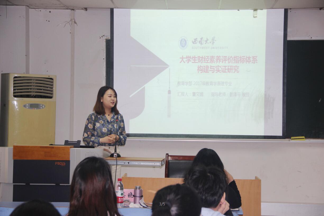 接着,16级教育学原理专业的李婷婷将“高职教师”和“工匠精神”相结合,展开个人的研究论述,介绍了高职教师工匠精神的含义、时代价值以及探寻路径等方面的内容;来自16级高等教育专业的赵珊珊从专业国际化视野出发,以加拿大和中国为例,研究学生的国际流动,展开了全英文的学术汇报;来自17级教育学原理专业的董文婧以“大学生财经素养评价指标体系构建与实证研究”为主题进行了论述,详细介绍了财经素养的结构及测量工具的编制,为相关问题提出了可行的对策和建议。
