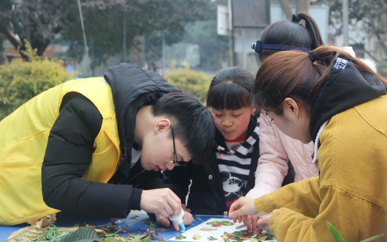 暖暖的阳光徐徐迎来了下午的活动。下午的活动由志愿者向慧主持、涂毅讲解。首先,志愿者以一首“树叶娃娃真顽皮,装点生活真美丽;小小瓶盖也神奇,巧妙组合有惊喜”这样的诗歌导入瓶盖画和树叶画。然后,志愿者讲解瓶盖画,带领学生探索瓶盖的奥秘。紧接着,让学生分享自己所带的树叶名字以及树叶的故事,然后向学生展示自己所带的树叶,带领孩子一起想象这些树叶像什么,可以制作成什么。然后,展示了一幅残缺的范画,先教孩子树叶粘贴画的步骤,粘贴方法,让孩子们自行发挥想象补充这幅图画;紧接着提供给孩子一些场景,引导孩子自己想象,尽情地进行创新。孩子们也都认真听讲、积极开动脑筋,个个都乐在其中。