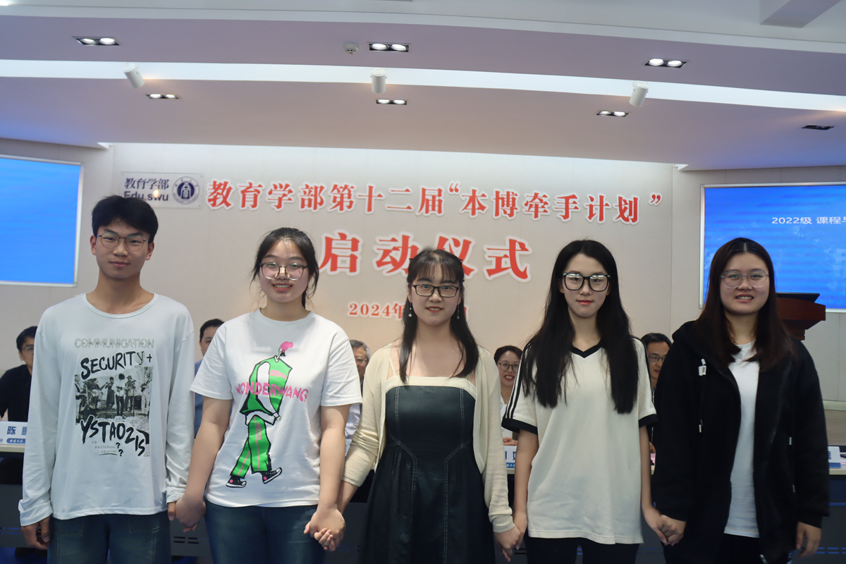 王正青副部长首先介绍了新修订的“本博牵手计划管理办法”,说明了博士生选拔条件以及工作职责与要求,对本科生学习的要求,强调了相关的管理要求。本科2023级辅导员陈鹏宣读第十二届“本博牵手计划”分组安排,各组博士生和本科生上台合影留念。