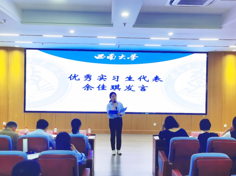 随后,由优秀实习生代表余佳琪同学发言,详细阐述实习过程中的体会与感悟,并分享了自己在教学实践中的探索与创新,以及对教育理论的深入理解和应用,展现了教育学子扎实的学术素养和追求卓越的精神风貌。