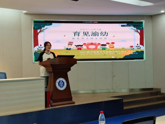 活动的核心议程为6个实习小组的总结汇报。西南大学实验幼儿园实习生代表刘霈暄以“育见西幼·共绘成长篇章”为主题,从深入理解师德情怀、多元探索保教实践、把握管理育人逻辑等方面展现了小组成员们的成长轨迹。北碚实验幼儿园实习生代表甄儒佳以视频导入,完整呈现了实习生组织教学和晨间锻炼、参与环创和教研的剪影,充满温情与感动。几江幼儿园实习生代表吴艺博、文怡蕾以“轻舟无惧万重山,前路漫漫亦灿灿”为主题,从起航、攀登、跨越、登顶四个阶段,递进地介绍了实习小队的转变与成长。鼎山幼儿园实习生代表董鑫妍以“当童心遇初心”为主题,从认识鼎幼、实践成长、研讨提升、特色活动四个方面进行了总结回顾。渝中实验幼儿园实习生代表潘冰燕以思维导图引入,分享了实习小队的日程计划,总结实习过程中的思考和成长。渝北幼儿园实习生代表俞雨围绕“育见渝幼”的主题,沿着实习四个月的时间轴线,完整回顾了实习小队的成长经历。