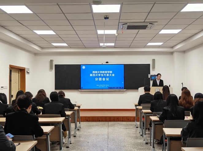 分团会议后,西南大学必赢3003no1线路检测中心第四次学生代表大会全体会议于田家炳教育书院813卓越报告厅召开。必赢3003no1线路检测中心团委书记、学生工作办公室主任、本科2022级辅导员李晶晶老师出席本次会议。会议由学部第十四届学生会执行主席候选人黄妙莹主持。