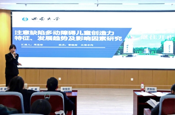 群贤毕至,学林雏凤清声起;智凝珠玉,赛场高台绽绮花。决赛中,十二个参赛小组分别从研究目的与意义、研究思路与方法、研究结论、不足等多方面对研究成果进行了汇报。其中,张琦同学带来的《西部乡村儿童性安全教育的困境与出路——基于甘肃省天水市H县中学》以西部乡村性安全教育欠缺为背景,探究了如何以绘本阅读、发放资源包等方式推动西部乡村性安全教育发展完善这一问题,展现了选手对社会热点的敏锐洞察力;周思彤同学带来的《注意缺陷多动障碍儿童创造力特征、发展趋势及影响因素研究》以ADHD儿童完成的不规则曲线图作为引入,采用测验法和横断设计法,深入剖析了注意缺陷儿童在创造力方面体现出的巨大潜力,极具专业特色。