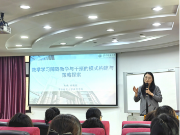 讲座伊始,李欢教授致欢迎词。朱楠副教授从数学学习障碍的研究背景、干预模式架构、国际经验借鉴等角度展开,系统阐述了数学学习障碍学生的教育和干预模式构建策略,为国内数学学习障碍学生的教育干预提供了理论框架与实践方向。