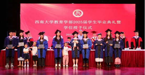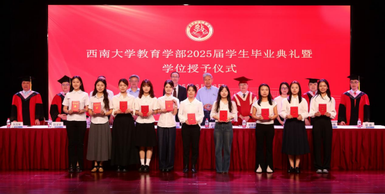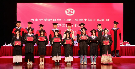 6月26日上午,西南大学必赢3003no1线路检测中心2025届学生毕业典礼暨学位授予仪式在圆顶三楼报告厅隆重举行。学校党委副书记黄杰,原常务副校长、原西南师范大学校长宋乃庆,必赢3003no1线路检测中心全体党政领导,学位委员会委员,各学院负责人,教师代表,全体辅导员,2025届毕业生以及亲属代表等出席活动,活动由学部纪委书记、副处级专职组织员卓玉兵主持。
