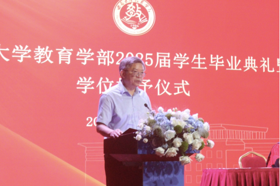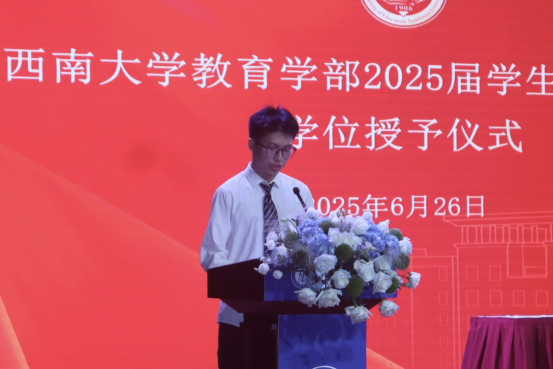 课程与教学论专业博士毕业生杨霞、教育技术学专业本科毕业生金哲宣分别作为2025届毕业生代表发言。杨霞回顾了自己在学部的求学历程,感恩国家政策与学部的培养,并号召毕业生保持好奇、敬畏真理、胸怀天下、服务社会。金哲宣讲述了自己在大学期间的实践成长经历,以行动诠释“德彰天下,学贯中西”的部训,愿以成长积淀的智慧与力量,在时代浪潮中坚定前行。