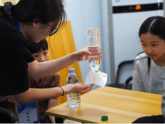 “大家猜一猜用牙签穿破我们的纸巾,纸巾会不会破?”实践成员指导孩子们利用空水瓶、纸巾和牙签,按照“倒满水→覆盖纸巾→缓缓倒扣→插入第一根牙签”的步骤动手操作。当孩子们亲眼见证纸巾不破、水不渗漏的神奇现象时,纷纷发出惊叹。接着,实践成员结合生活实例讲解表面张力原理,进一步激发了孩子们的科学探索兴趣。