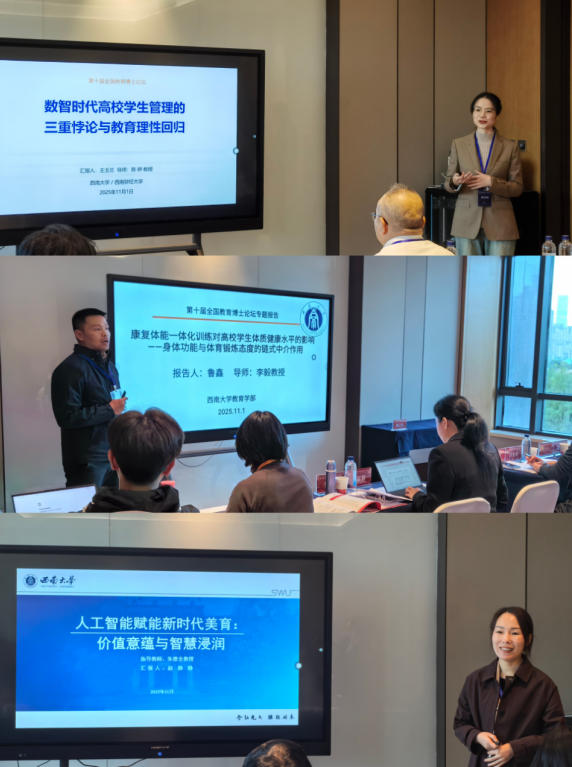 学部5名教育博士研究生在多个分论坛,结合自身研究方向与学术成果,围绕大会主题展开专题发言。他们的研究内容涵盖教育学自主知识体系构建、高校教师发展、学校体育和美育等领域,体现出较强的现实针对性与学术创新性,充分展示了西南大学教育博士生的学术素养、研究能力与精神风采,部分发言引发参会专家的进一步讨论与交流。