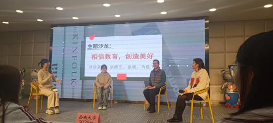 在主题沙龙环节,余璐老师和巴蜀幼儿园张维亚、张桢、马俊飞老师围绕“相信教育,创造美好”这一主题,展开了深入的对话和交流。三位老师结合自身专业选择、专业适应、教学工作分享了自己的经历和感悟,耐心地解答了同学们提出的问题,鼓励同学们夯实专业基础、提升实践能力、拓宽前沿视野,成长为幸福的高素质学前教育工作者。