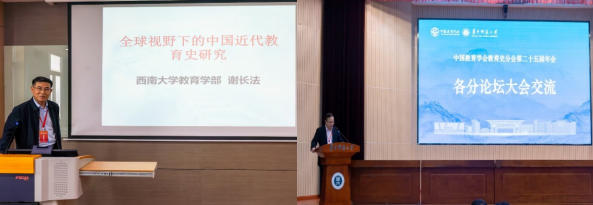 会上,中国教育学会教育史分会副理事长、西南大学教育史学科负责人谢长法教授主持大会主题报告,并在分论坛作题为《全球视野下的中国近代教育史研究》的汇报。学部徐辉教授在大会主题报告上作了《新时代外国教育史教学指导思想的若干思考》的汇报。彭泽平教授主持了第四分论坛,并代表第四分论坛就分论坛研讨、交流情况进行了总结发言。