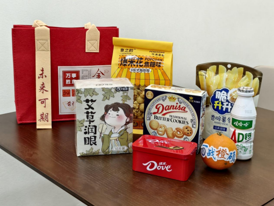 随后,学部领导老师们一同为考研学子发放了“考研加油包”。每一份礼物都承载着深切祝福与美好寓意:脆升升薯条象征着“分数升升”,皇冠曲奇寓意“一举夺冠”,爆米花期待“好运爆棚”,巧克力助力“巧克难题”,娃哈哈AD钙奶带来“考完笑哈哈”的轻松,橙子寄托“一战成硕”的心愿,蒸汽眼罩帮助舒缓疲劳,毛毡包则寓意“包你上岸”,陪伴学子装下所有努力与期盼。此外,还有西大印象茶小站提供的专属奶茶兑换券和集点卡,为备考生活增添一丝甜意与温暖。